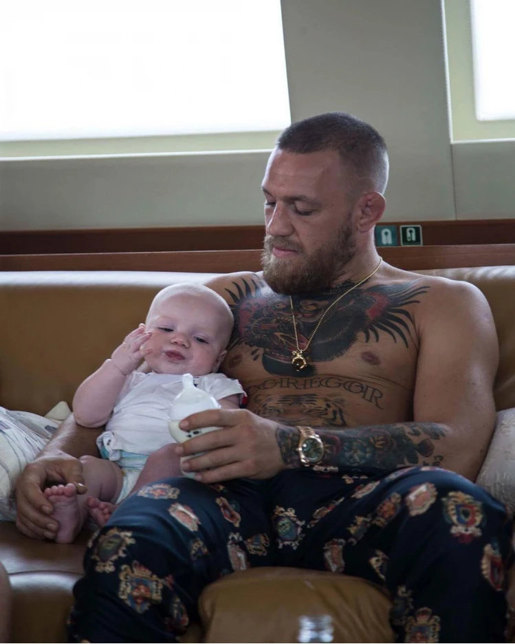 Совсем иным, как по публичному поведению, так и в отношении своей семьи, предстает Конор Макгрегор. Эксцентричный и взбалмошный ирландец готов делать шоу всегда и везде. Стоит хотя бы взглянуть на его поведение на первой совместной с Хабибом пресс-конференции, чтобы понять: это прирожденный шоумен и настоящий плохой парень. Однако, раскрывая иногда подробности своей личной жизни или делясь семейными фото, Конор и сам раскрывается с другой стороны: как примерный семьянин и милейшей папаша. Да, в нагоняющих жути татухах и с брутальной бородой, да, весь в золоте, словно персонаж Брэда Пита из фильма «Большой куш», но видимо Конор все же человек — даже вроде бы с душой и сердцем.