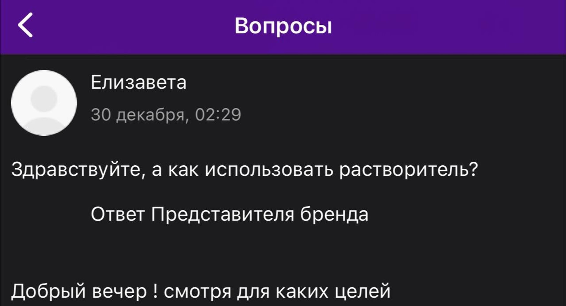 Например, пользователи маркетплейса почему-то спрашивают у представителя о том, какое количество «растворителя» им понадобится с учетом их возраста и веса. А еще клиенты просят удалить заказы из истории их покупок. При этом на вопросы сомневающихся в законности происходящего продавец отвечает: «Мы продаем растворитель для краски, все должные документы у нас имеются».