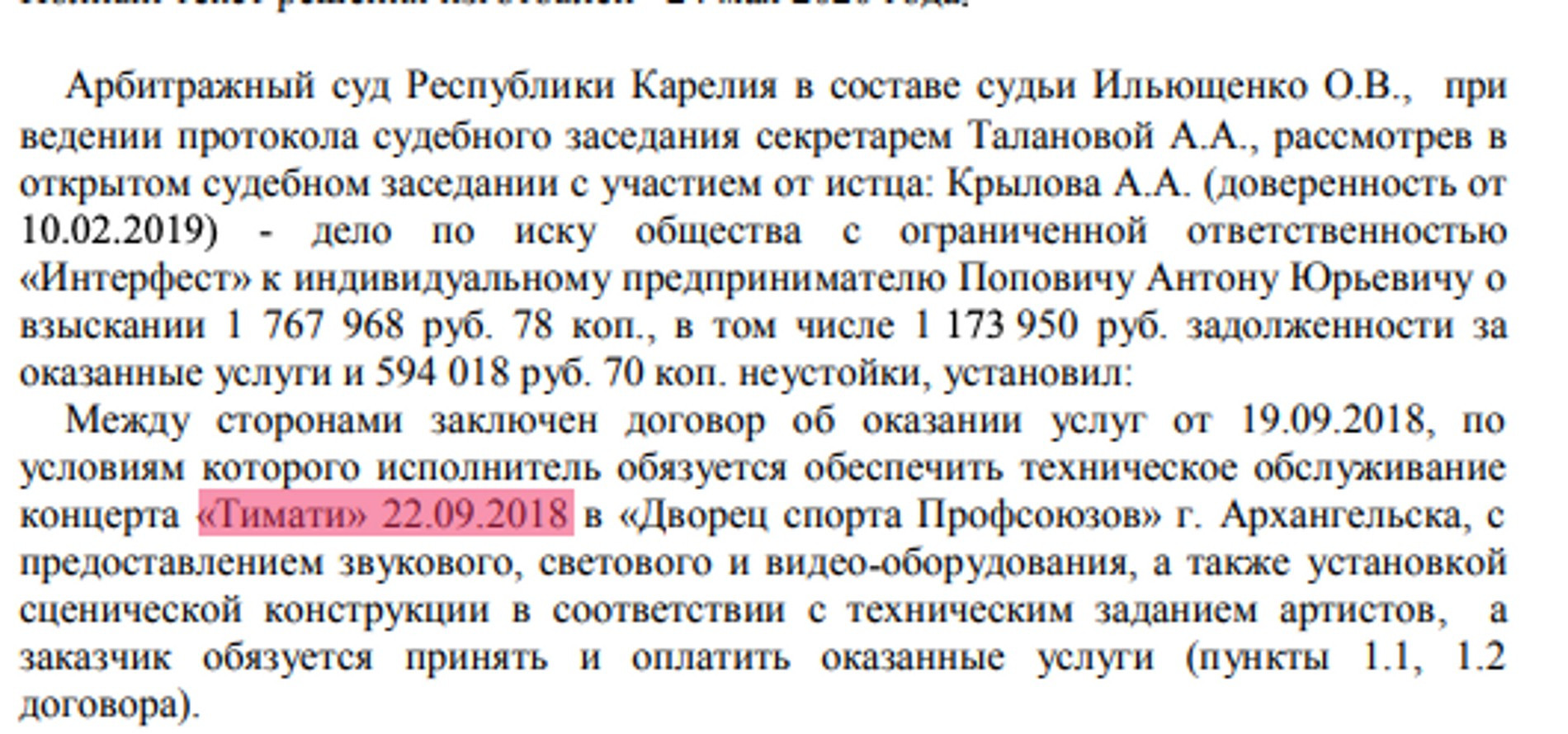Тогда суд вынес решение в пользу Тимати и потребовал взыскать с Поповича долг на сумму около 1,4 млн рублей. Замешанной в деле оказалась и сторонняя компания — ООО «Интерфест», которая отвечала за звук, световое и видеооборудование на концерте. В пользу «Интерфеста» суд потребовал взыскать с Антона Поповича примерно 1,8 млн рублей.
