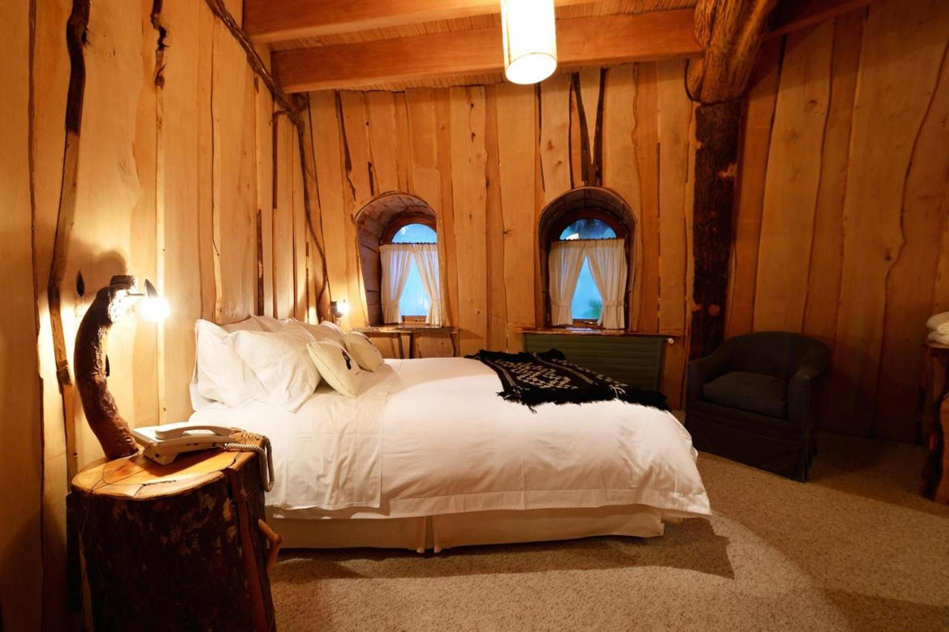 Тема девственного леса максимально раскрывается в ресторанах заповедника. Массивная мебель, колонны-стволы, фантастические коряги в качестве декора, панорамные окна, в которые застенчиво заглядывают деревья словно в ожидании приглашения на огонек. Но речь не только про антураж: зелень, ягоды, ростки и коренья — большинство продуктов на кухню попадает, конечно же, из леса. В меню ресторана Nothofagus — блюда, приготовленные по локальным рецептам. Как насчет оленины в соусе из мирта с рагу из зеленой фасоли? А форель, которую запекают в зеленом масле, укропе и шалфее, выловлена в близлежащей реке.