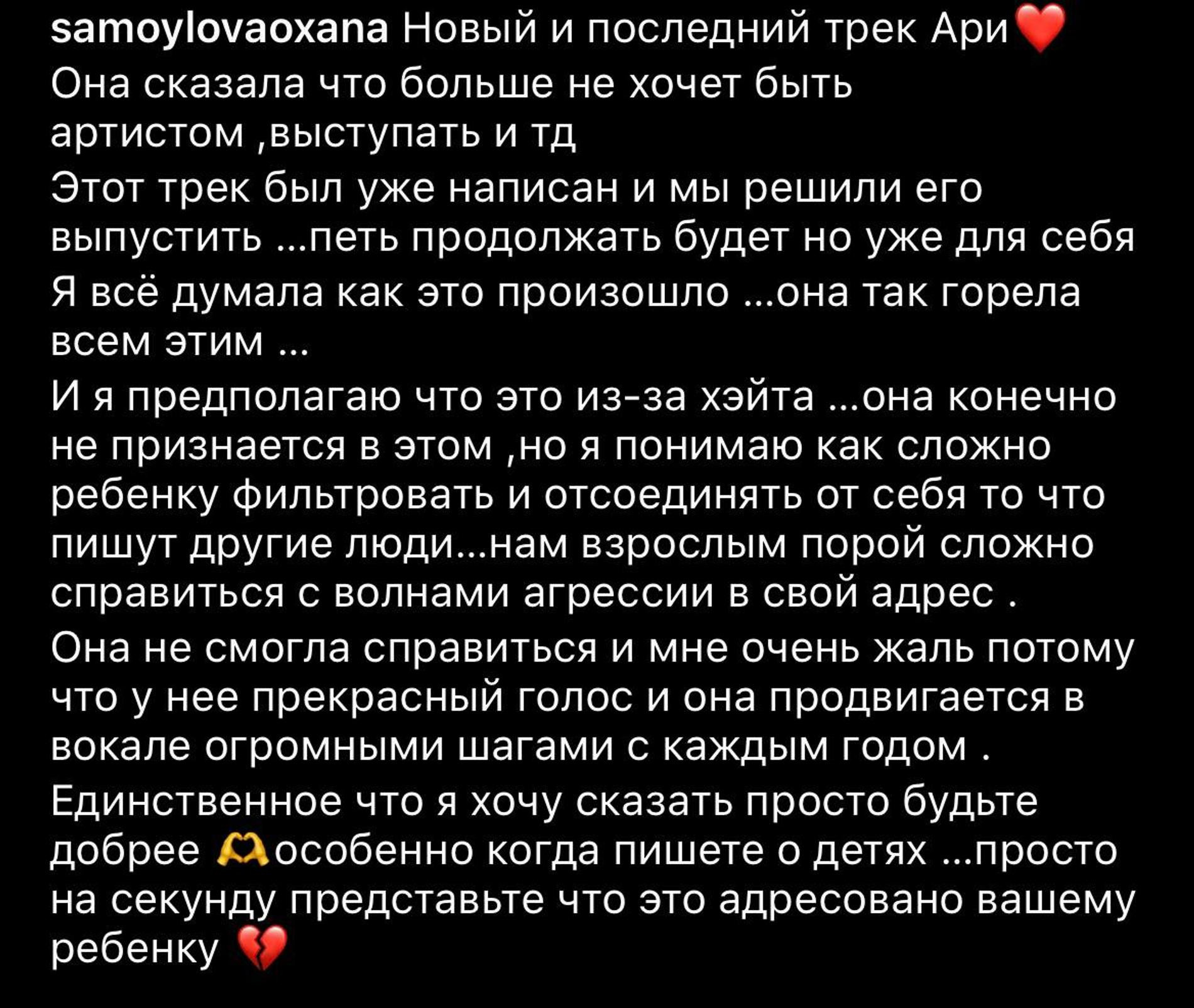 Накануне бизнесвумен опубликовала ролик с последним треком Ари и сделала важное заявление: покорять сцену девочка больше не намерена, причем по собственному желанию. «Я все думала, как это произошло. Она так горела всем этим. И я предполагаю, что это из-за хейта... Она, конечно, не признается в этом, но я понимаю, как сложно ребенку фильтровать и отсоединять от себя то, что пишут другие люди», — высказалась Оксана в запрещенной соцсети. Она уверена: Ариела не справилась с ненавистью и агрессией со стороны недоброжелателей, а потому, несмотря на огромные успехи в вокале, петь на публике она отныне не хочет.