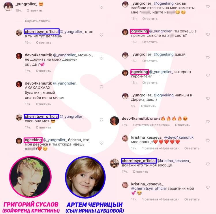 Интерес к Кесаевой проявляет и 12-летний сын Ирины Дубцовой, который учится в одной школе с ней. «Докажи, что ты моя вообще», — обращается Артём Черницын к Кристине, а с другими её воздыхателями мальчик более груб: «Саси, она моя» (орфография сохранена).
