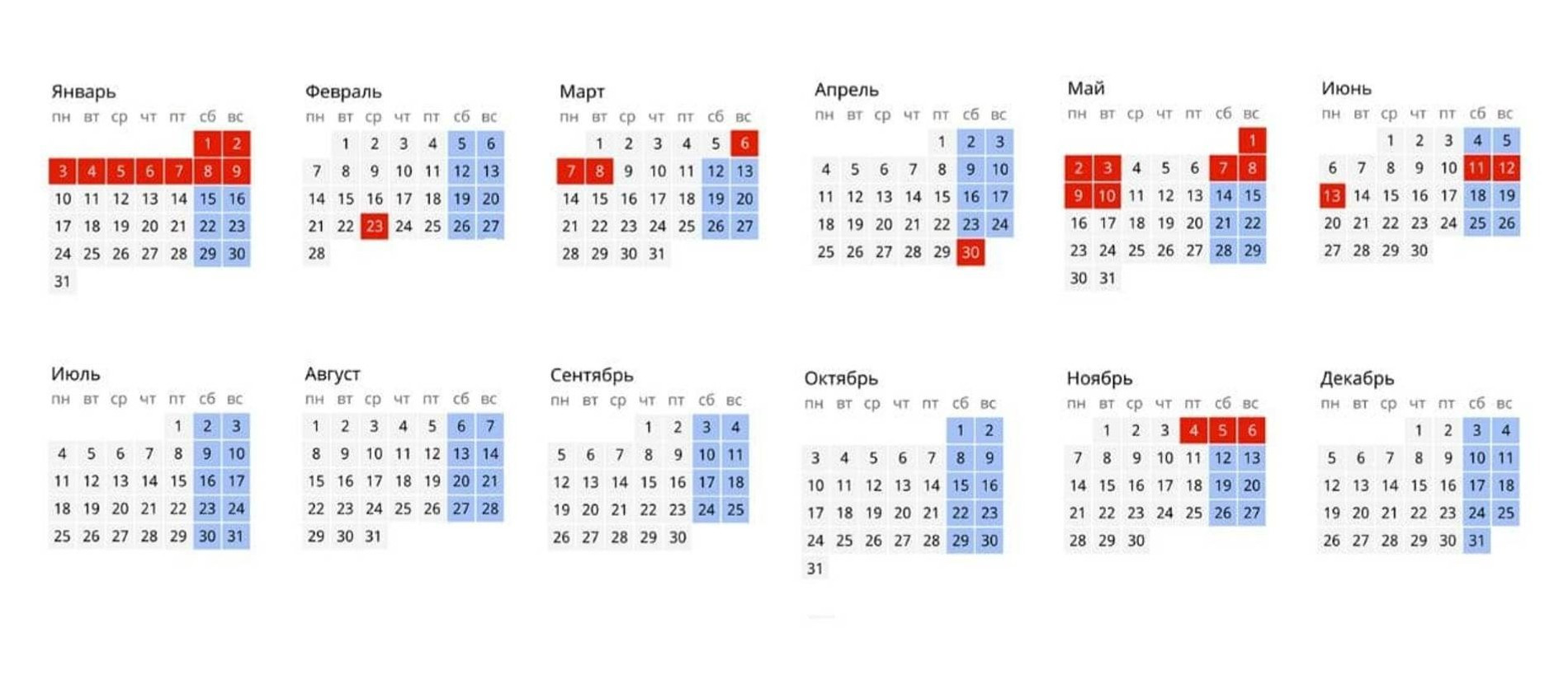 Правительство утвердило производственный календарь на 2022 год, сообщается в официальном Telegram-канале кабинета министров. Так, выходные дни 1 и 2 января приходятся на субботу и воскресенье, да еще совпадают с нерабочими праздничными днями, поэтому их переносят на 3 и 10 мая соответственно. Таким образом, в мае у граждан будет два четырехдневных отдыха — с 30 апреля по 3 мая и с 7 по 10 мая. Также трехдневные выходные будут по случаю 8 Марта. Но перед этим гражданам предстоит шестидневная рабочая неделя, поскольку нерабочая суббота 5 марта перенесена на понедельник, 7 марта.