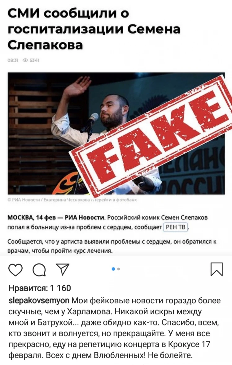В то же время, директор артиста Евгения опровергла информацию о госпитализации Семёна: «Опровергаем. Всё в порядке. Он готовится к концерту». На странице Слепакова в Instagram также появился пост о том, что новости о его проблемах со здоровьем — фейк: