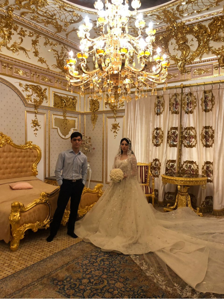 Но не только официантам и поварам пришлось потрудиться: шикарное платье 18-летней невесты, сшитое специально для торжества Зухаиром Мурадом, не только стоило 17 миллионов, но и весило 45 килограммов! Девушка даже не могла самостоятельно подняться на второй этаж ресторана, так что передвигаться ей помогали несколько «фрейлин».