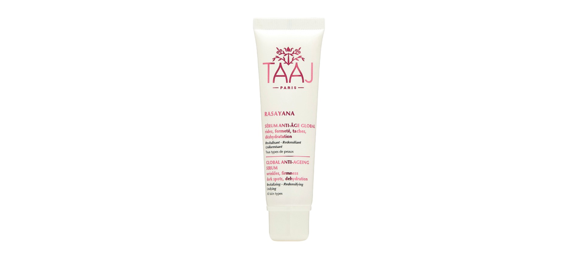 Пока для подавляющего большинства увлечение аюрведой ограничивается латте с куркумой, французский бренд Taaj решил использовать лучшие наработки индийской альтернативной медицины в создании косметики. Марка делает ставку на натуральные и безопасные формулы с активными компонентами. В случае с антивозрастной сывороткой в составе используют облепиховое масло, семена тамаринда и гималайский нард. Они помогают коже поддерживать уровень увлажнения и упругости, выравнивают микрорельеф и цвет лица.