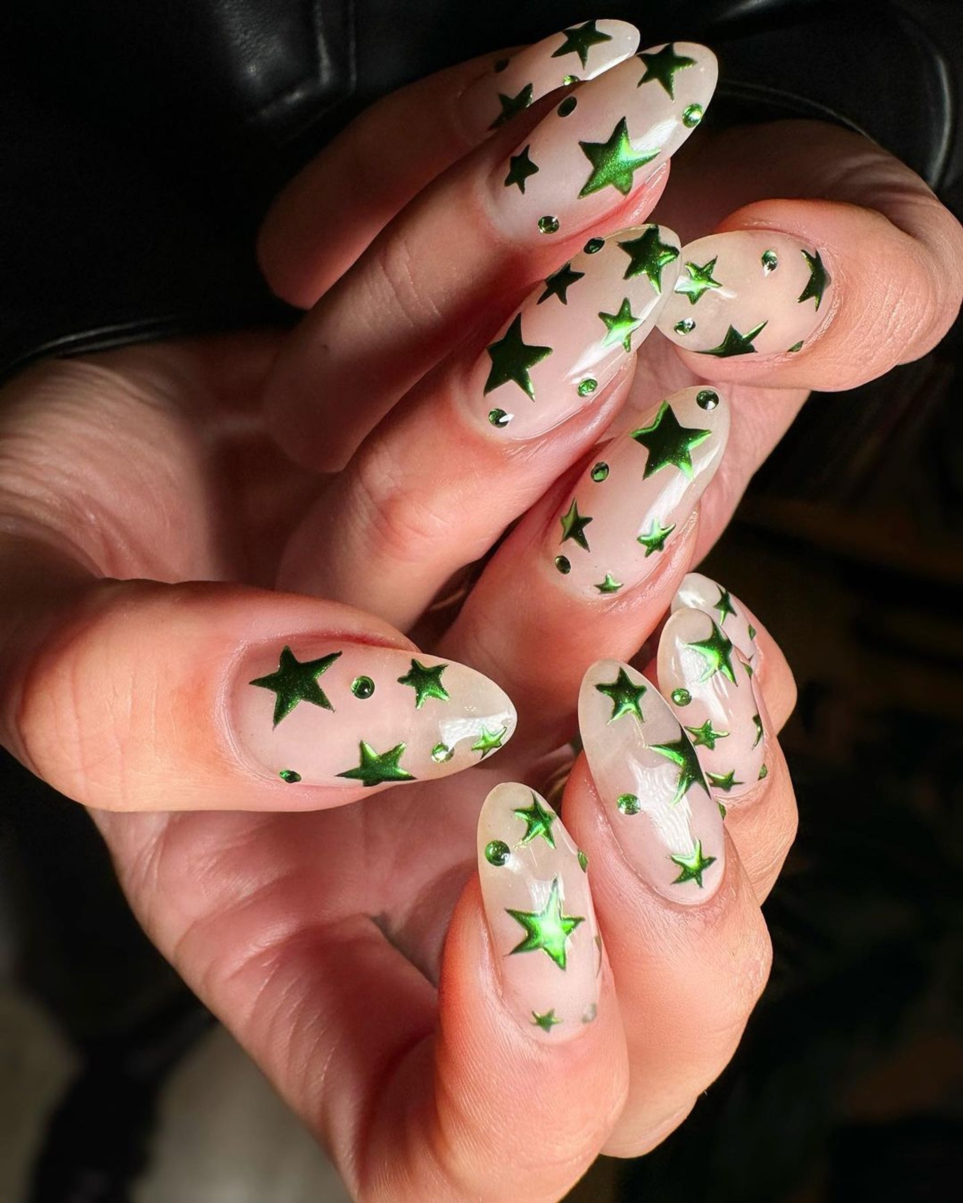 Милые сердечки и смайлики были в ходу в 2022 году и изрядно надоели. На смену им приходят объемные звездочки. Размер значения не имеет, цвет и фактуру также можно смело подбирать на свой вкус. При очевидной простоте, такой маникюр смотрится оригинально и привлекательно. Из минусов — плохая совместимость со строгими образами, но и здесь спасут эксперименты с количеством декора. Из плюсов — такой дизайн можно сделать даже дома.