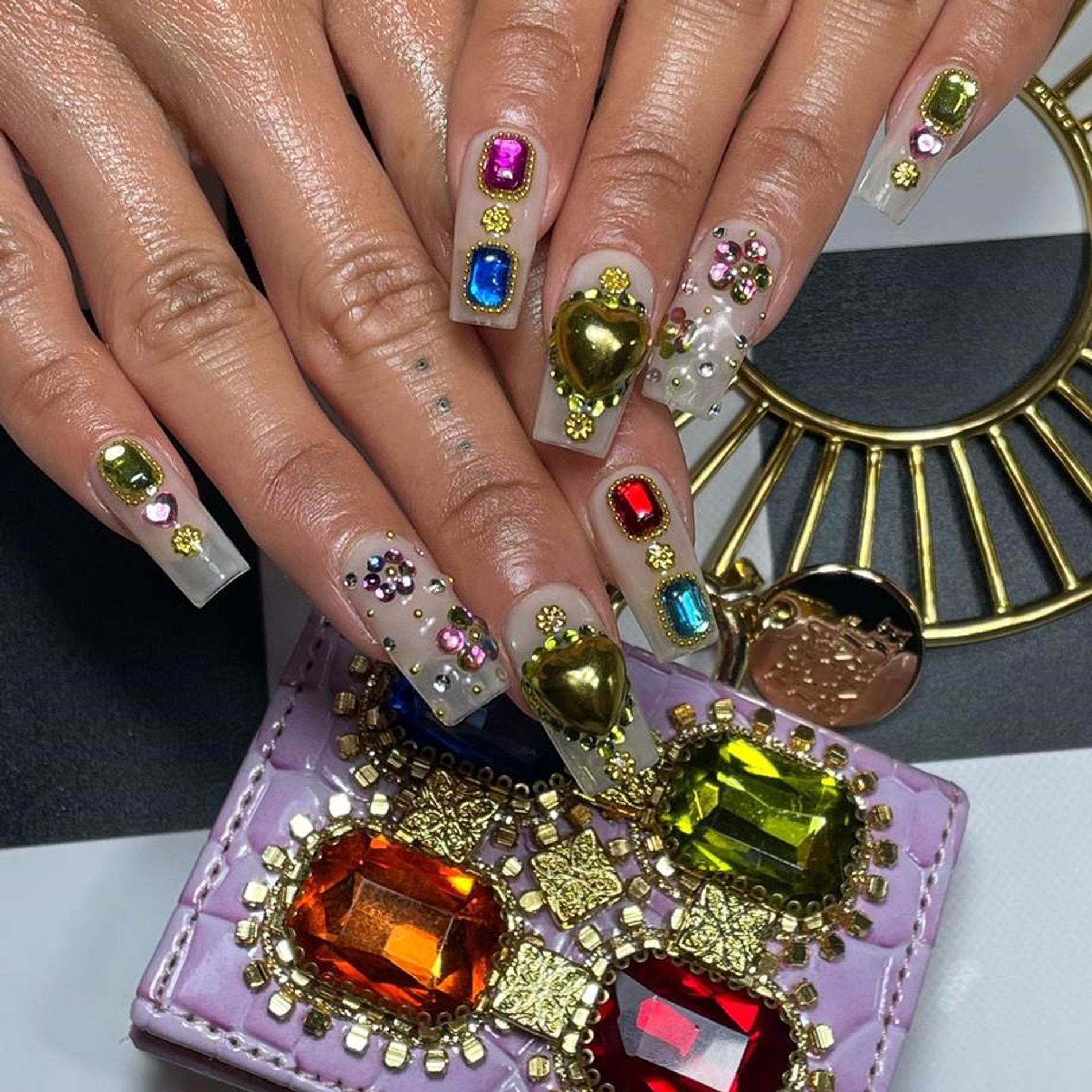 Не спешите закатывать глаза, стразы вернутся не сами по себе, а в рамках вполне конкретной идеи — изображения драгоценности. Избегайте обилия мелких камушков. Для реализации этого тренда больше подойдут средние и крупные стразы. Согласитесь, выглядит совсем не дешево!