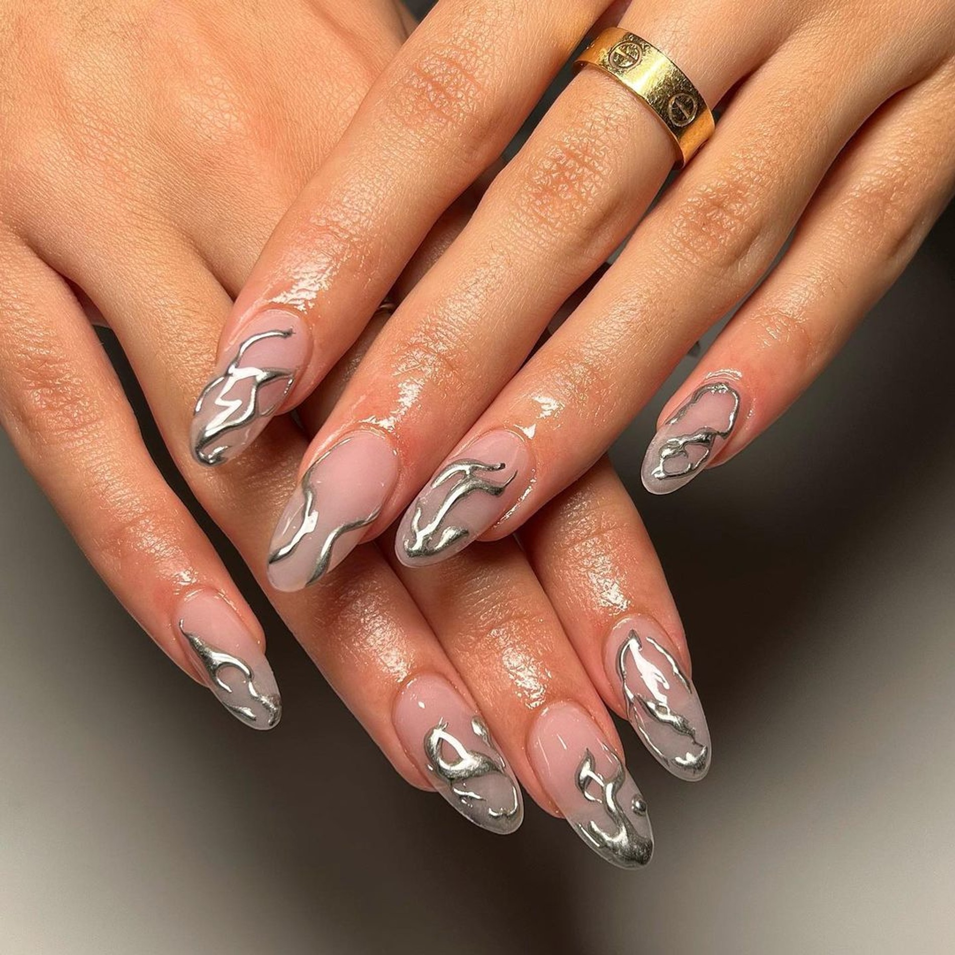Жидкий металл решительно возвращается в нейл-дизайн на фоне всплеска интереса к гранж-эстетике. Возвел это направление на модный олимп дизайнер Марк Джейкобс еще в 90-х. Этот бунтарский стиль «вне» моды время от времени вкрапляется даже в коллекции тяжелого люкса и, кажется, никогда не надоедает. Широкие джинсы и футболки, приправленные находками из секонд-хэнда, стали новой классикой на все случаи жизни. Дополняйте их «ртутью» на ногтях и добавляйте еще металла в образ — например, любимую кожанку с заклепками, — пускай своенравный маникюр станет вашим маленьким вызовом миру моды в духе гранж.