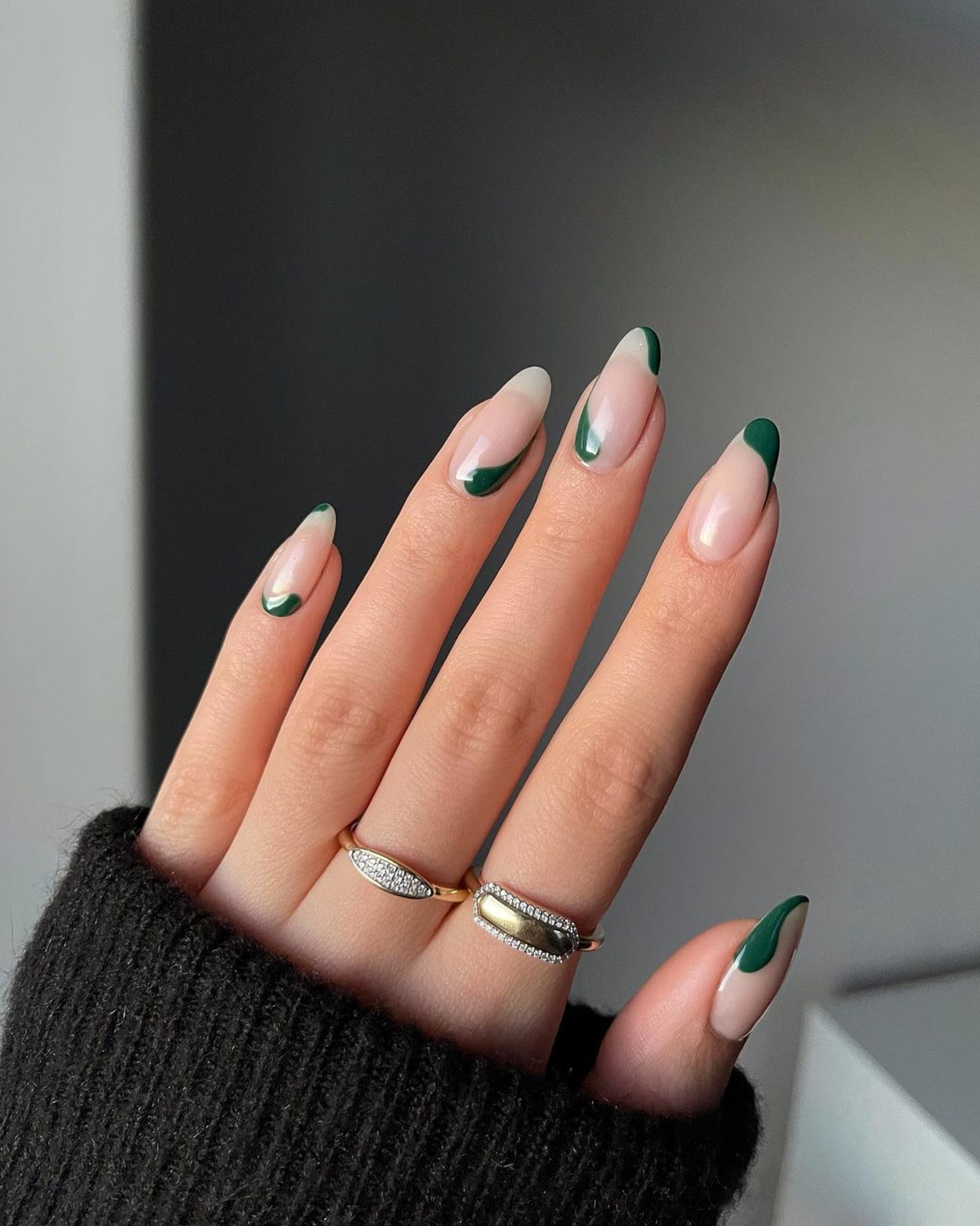 Выделять лишь один ноготь на фоне остальных — классный прием для любительниц необычного дизайна. Покрываем ногти глянцевой базой, делаем изумрудный френч, пропуская ноготь на безымянном пальце. На нем вместо зеленого наносим белый и проводим тонкую волнистую линию из центра кончика.