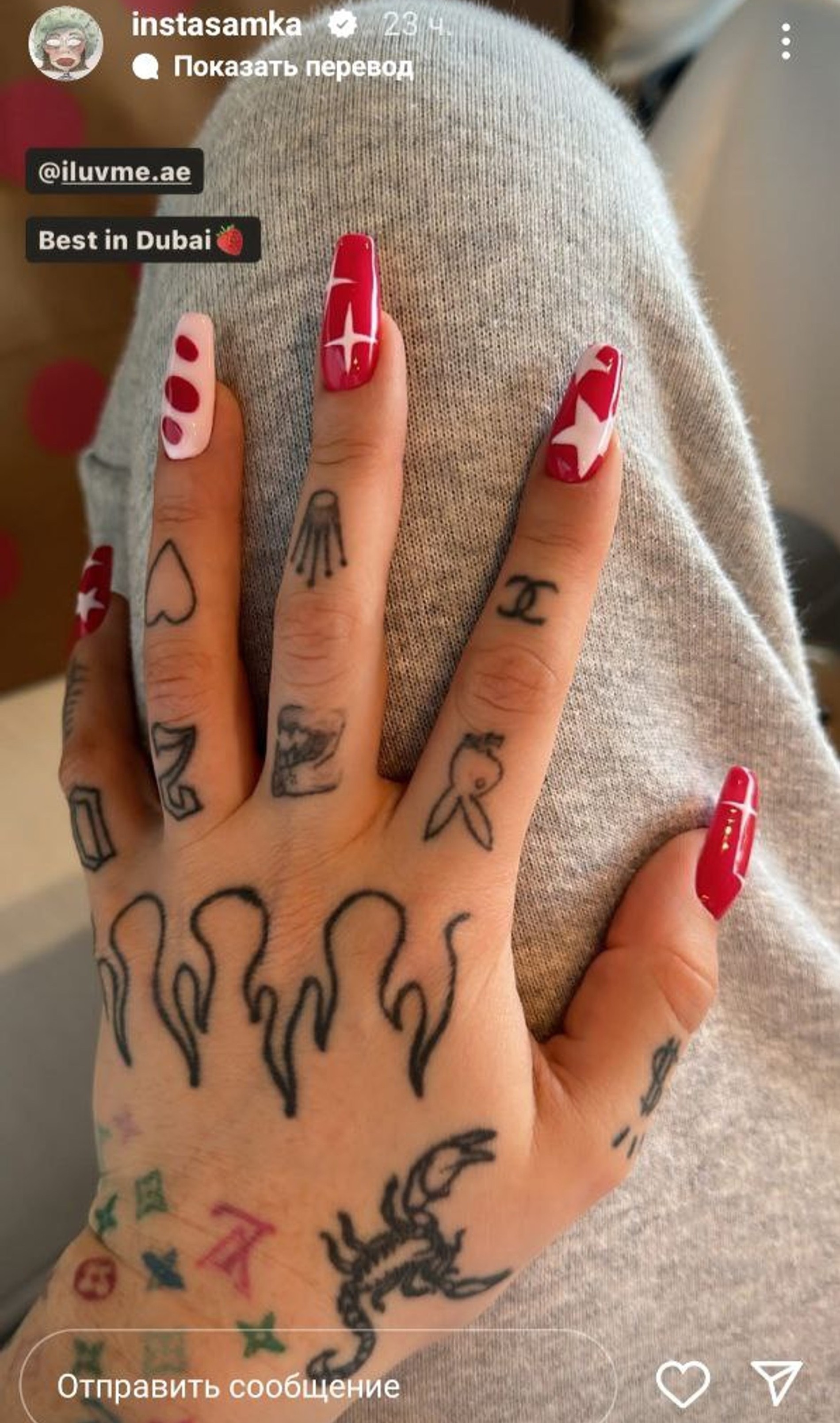 Даша Зотеева (настоящее имя Инстасамки) выбрала в буквальном смысле звездный дизайн в красно-белой гамме. Главная особенность такого маникюра: оригинальный, неповторяющийся рисунок на каждом ногте. Звезды, которые должны быть разной формы и размера, отсутствуют только на безымянном пальце. Форма тоже не самая популярная и смелая: ногти балерины.