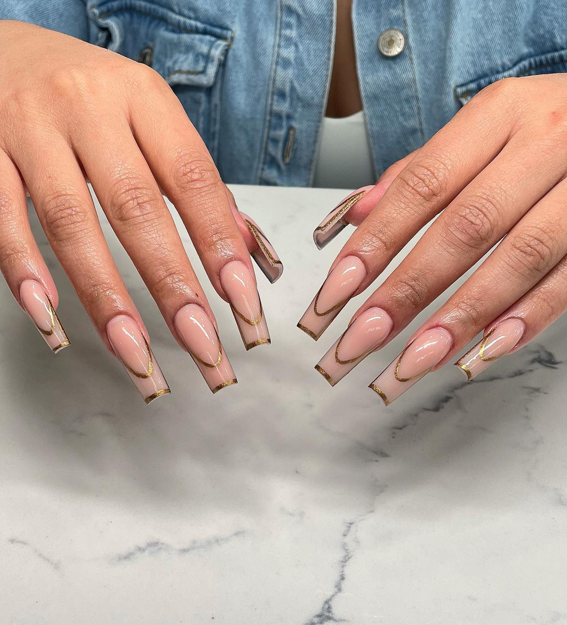 Для выигрышного эффекта рекомендуем рисовать контур золотистыми оттенками. Плюс этого тренда в том, что на разной форме он выглядит совершенно по-разному, главное, не закрашивать кончик ногтя, достаточно провести полосу по линии улыбки и при желании по самому краю. А еще важно оставить достаточно воздуха.