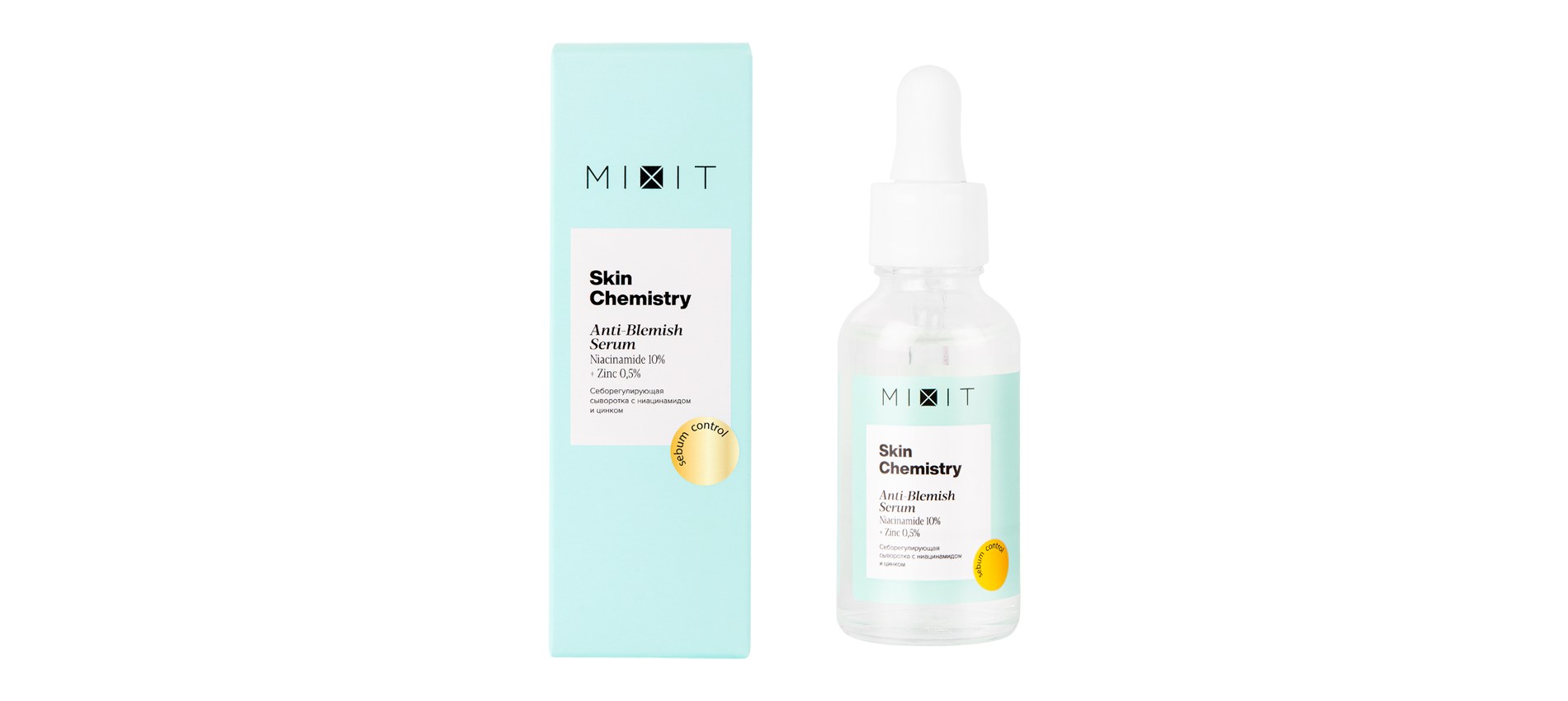 Ниацинамид и цинк, на которых держится сыворотка Mixit, — проверенная комбинация себорегулирующих компонентов. Средство постепенно нормализует активность сальных желез: при регулярном применении они выделяют меньше себума, что и обеспечивает матирующий эффект.