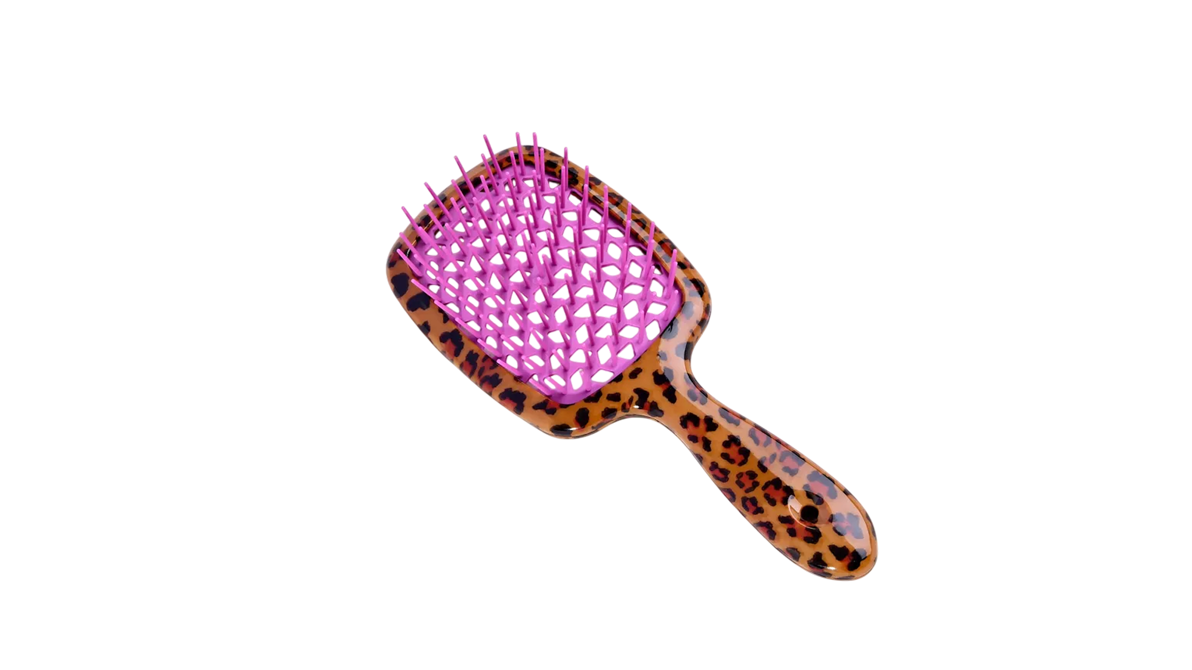 С длинными густыми волосами нельзя справиться без широкой массажной расчёски. Эта версия — с дерзким леопардовым принтом и довольно длинными зубчиками для удобства укладки. Благодаря сетчатой основе получится высушить пряди быстрее обычного. Воздух от фена будет циркулировать свободно и равномерно прогревать, помогая не «пережарить» причёску.
