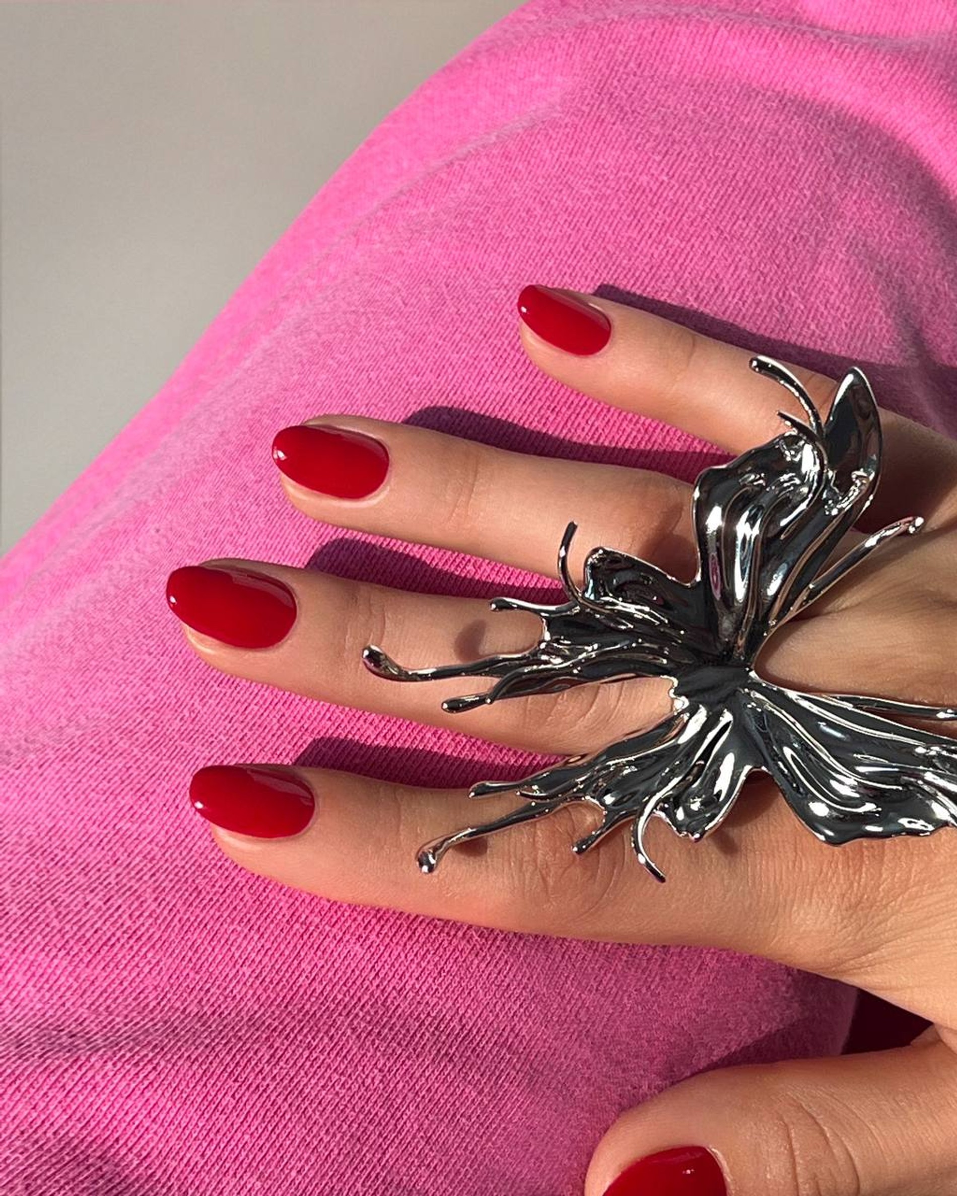Не забыла Дина продемонстрировать и свой маникюр. Тиктокерша предпочла классику жанра: обычное покрытие красным лаком на ногтях овальной формы (спасибо, что не стилеты!) и никакого сложносочиненного рисунка. Видимо, за нетривиальность в данном случае отвечает кольцо в виде гигантской бабочки. Жирный лайк однако.