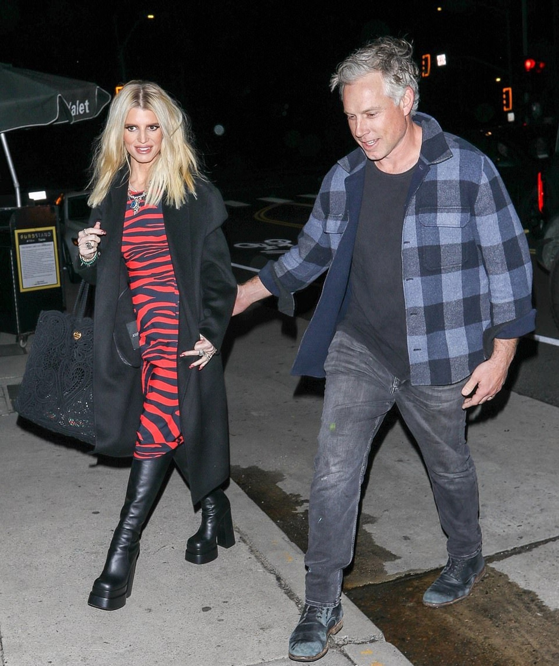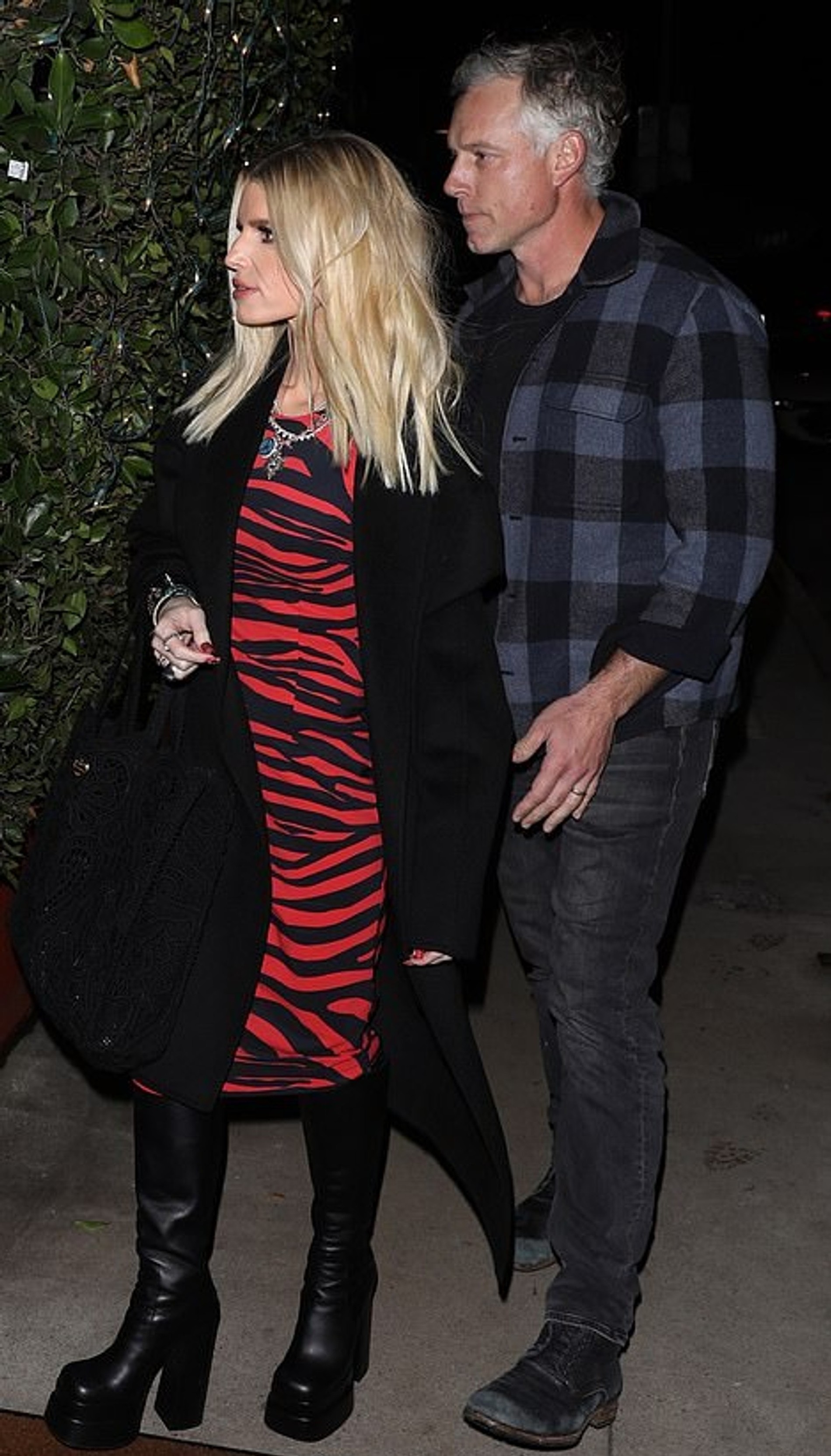 Для ужина Джессика выбрала платье миди в черно-красную полоску и кожаные сапоги на массивной платформе. Яркий образ она дополнила макияжем в естественной гамме с акцентом на глазах. Честно говоря, из-за пальто свободного кроя довольно сложно оценить параметры фигуры Симпсон. Но с уверенностью можно сказать, что певица выглядит ярко и бодро.