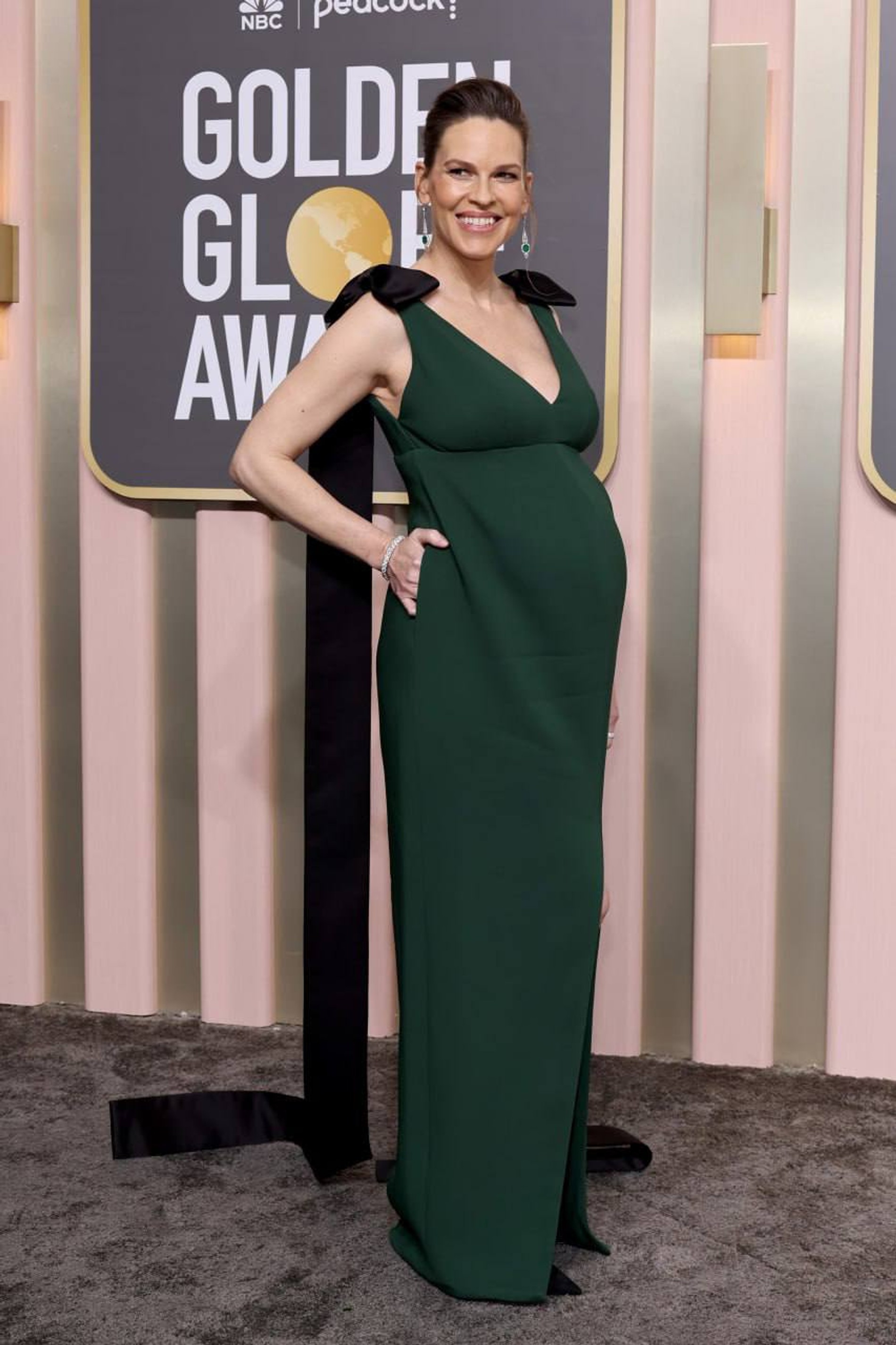 У 48-летней Хилари Суонк, звезды фильма «Малышка на миллион», уже внушительный срок беременности. Выглядит при этом она прекрасно! Чувствует себя, по всей видимости, так же. Минувшей ночью оскароносная актриса блистала на красной дорожке 80-й церемонии вручения премии «Золотой глобус» в Лос-Анджелесе. Для знакового мероприятия в киноиндустрии Хилари выбрала платье в пол темного-зеленого цвета с v-образным вырезом и бантами на плечах, а волосы убрала в скромный пучок. Получился элегантный и одновременно эффектный образ. Ставим уверенный лайк очаровательной будущей маме близнецов!