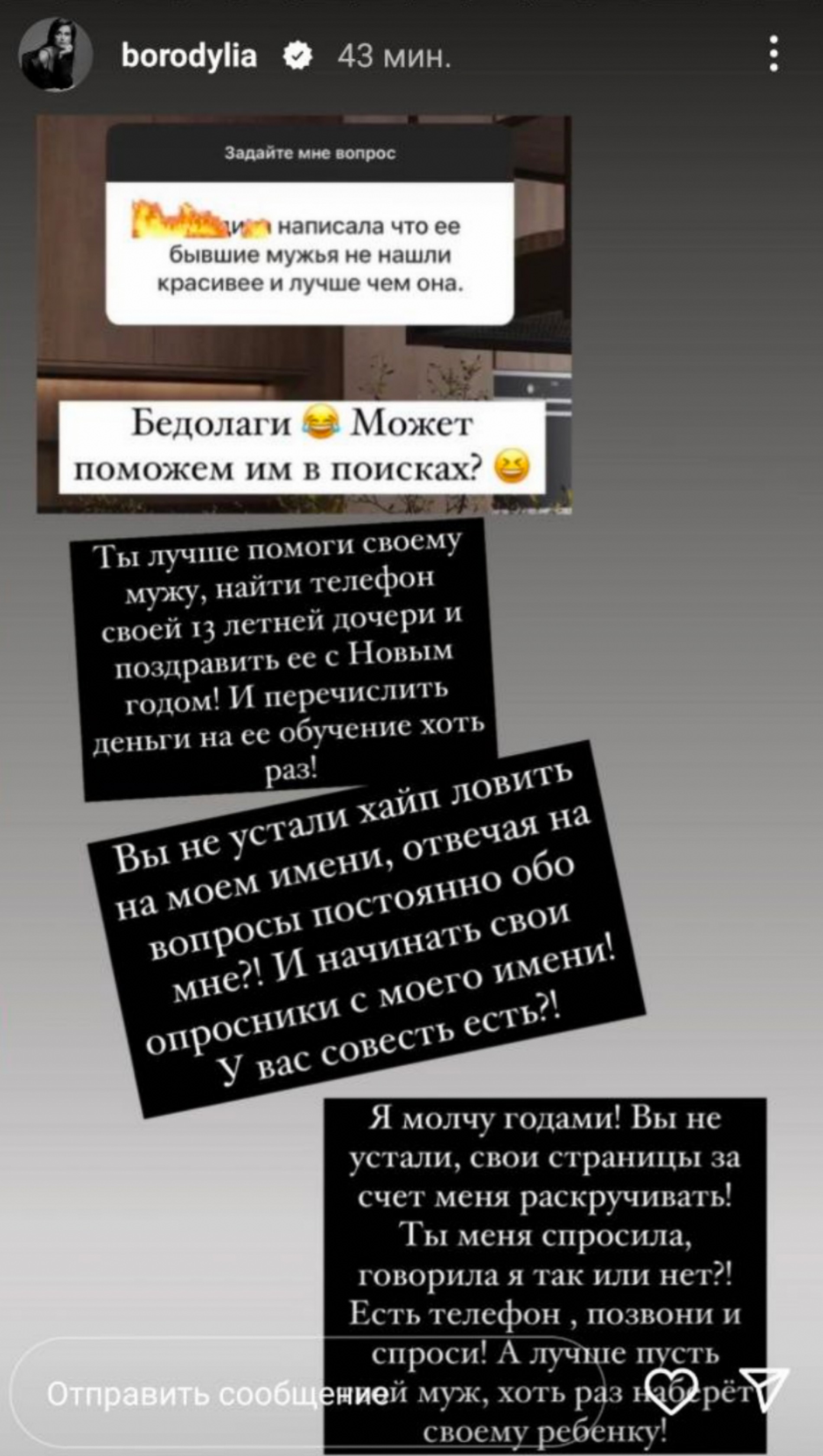«Ты лучше помоги своему мужу найти телефон своей 13-летней дочери и поздравить ее с Новым годом! И перечислить деньги на ее обучение хоть раз!» — не осталась в долгу телеведущая. Тут же в запрещенной соцсети она поинтересовалась: «Вы не устали хайп ловить на моем имени, отвечая постоянно на вопросы обо мне? У вас совесть есть? Вы не устали свои страницы за мой счет раскручивать?» Также Бородина призвала девушку впредь звонить ей в подобных ситуациях и все выяснять лично: «Ты меня спросила, говорила я так или нет? Есть телефон, позвони и спроси! А лучше пусть твой муж хоть раз наберет своему ребенку!»