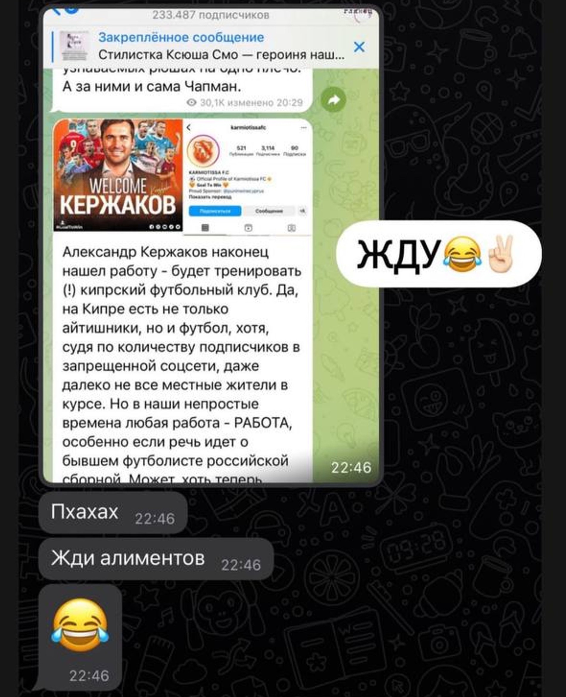 Недавно стало известно, что 40-летний спортсмен будет тренировать футбольный клуб «Кармиотисса» на Кипре. Не знаем, подработка это для Александра или нет, но сотрудничество с зарубежной организацией наверняка предполагает зарплату в долларах, а то и в евро. Приятельница Миланы тоже об этом подумала и в личной переписке с моделью подметила, что сумма алиментов может увеличиться. Той же комментарий показался настолько жизненным, что она посчитала нужным выложить скриншот в своем блоге. «Жду», — была немногословна Милана.
