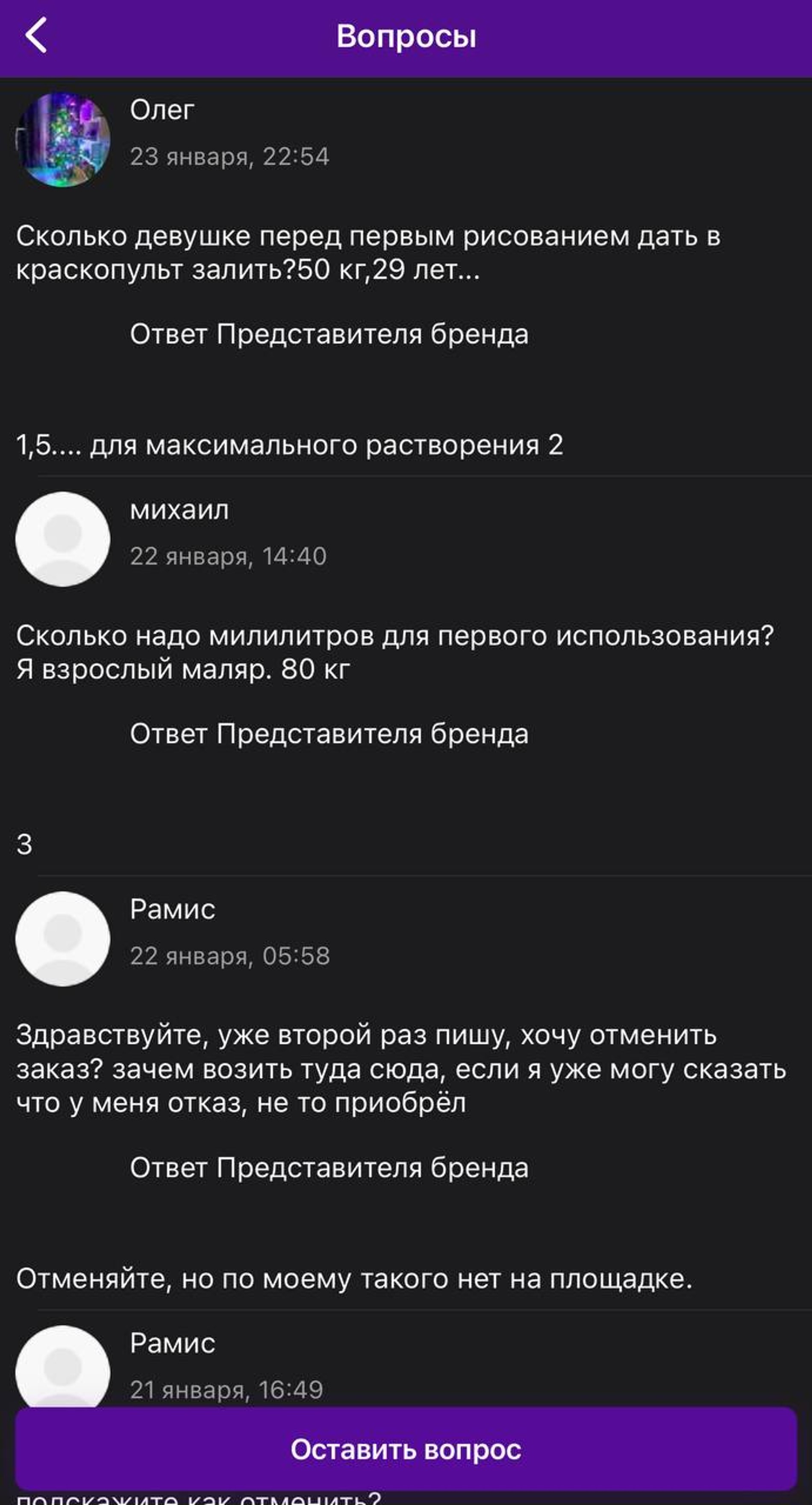 Например, пользователи маркетплейса почему-то спрашивают у представителя о том, какое количество «растворителя» им понадобится с учетом их возраста и веса. А еще клиенты просят удалить заказы из истории их покупок. При этом на вопросы сомневающихся в законности происходящего продавец отвечает: «Мы продаем растворитель для краски, все должные документы у нас имеются».