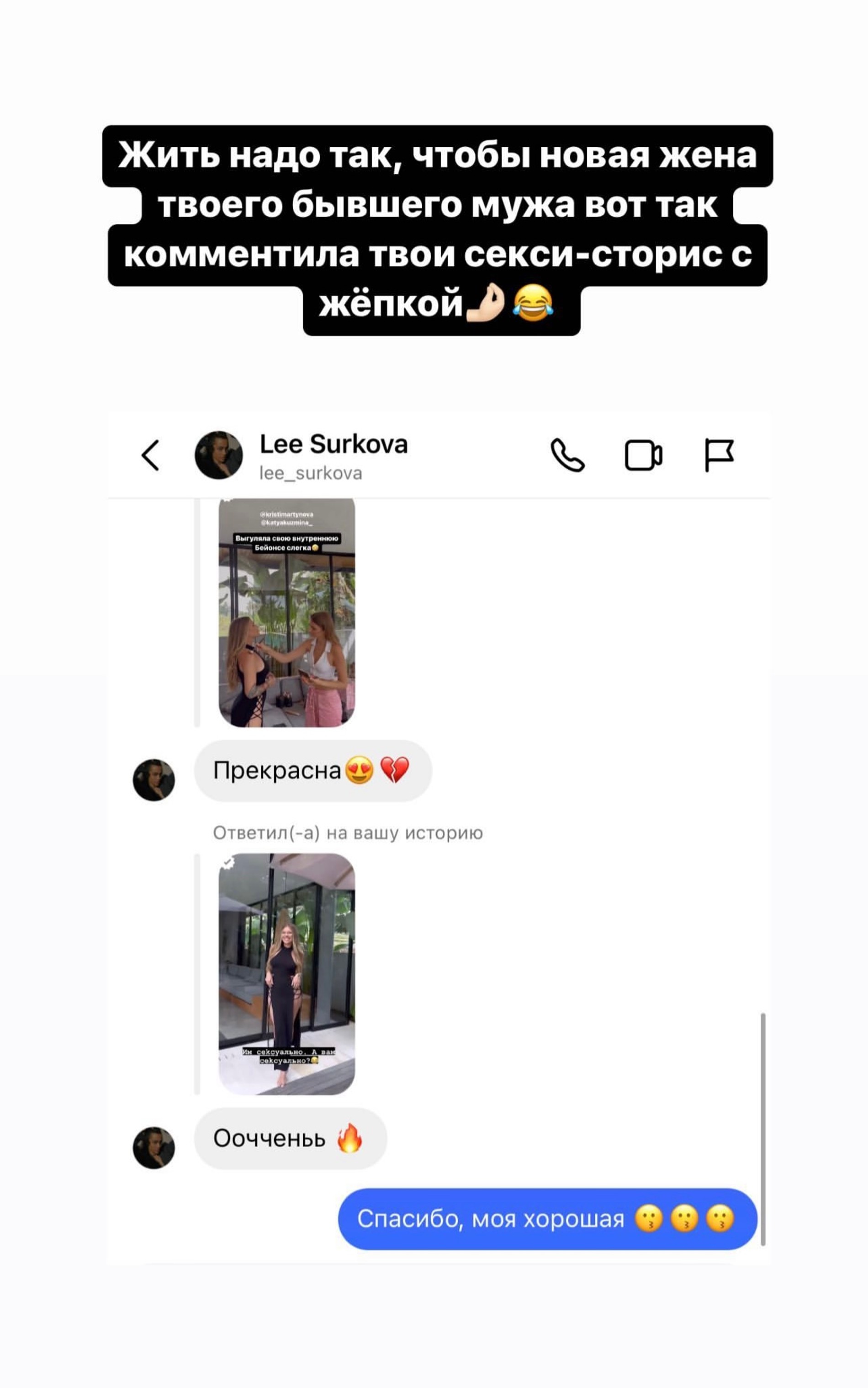 В общении с нынешними девушками своих бывших Рита достигла небывалых высот. «Жить надо так, чтобы новая жена твоего бывшего мужа вот так комментила твои секси-сторис», — шутливо написала Рита и прикрепила скриншот, на котором возлюбленная Соколовского Ангелина Суркова восхищается ее красотой.