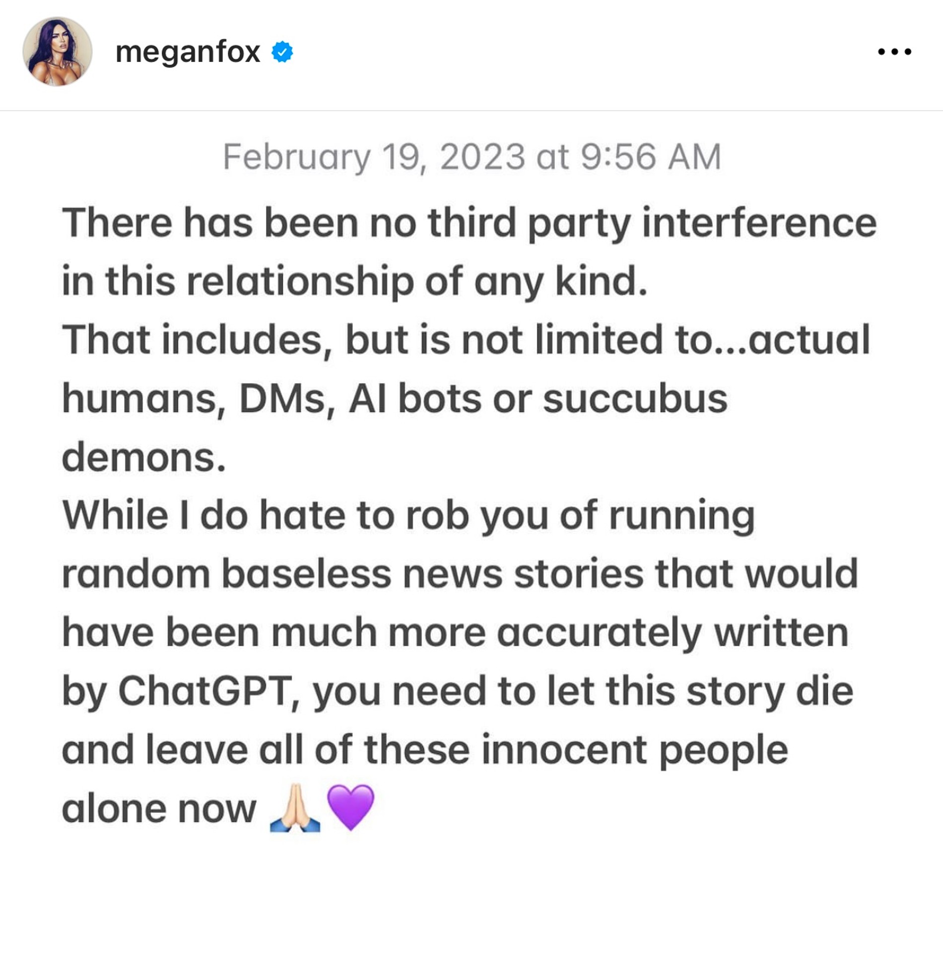«Никакого вмешательства третьих лиц в эти отношения не было. Если, конечно же, не говорить об интернет-пользователях, ботах и демонах. Несмотря на то что я очень не хочу лишать вас возможности распространять необоснованные сплетни, которые гораздо лучше были бы написаны ChatGPT [чат-бот с искусственным интеллектом], вы должны похоронить эту историю и оставить всех невинных людей в покое», — написала Фокс.