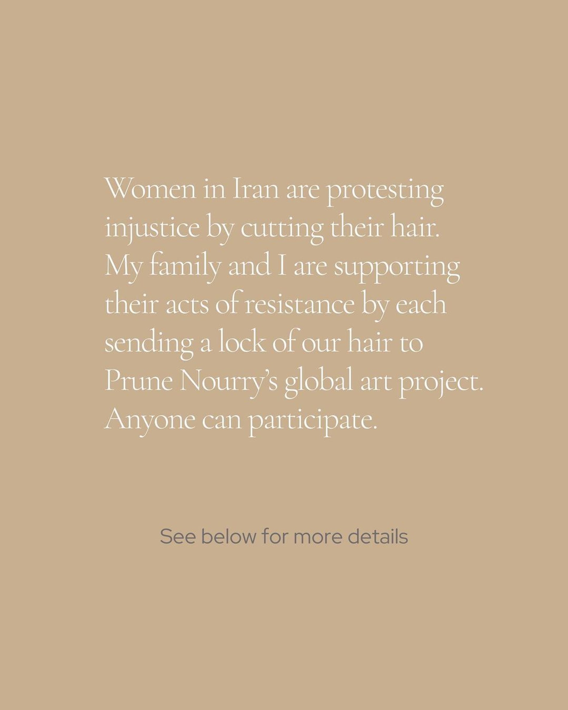 «Моя подруга Прюн Нурри руководит прекрасным художественным проектом, почитающим мужество и выражающим солидарность с храбрыми женщинами Ирана, которые борются за равенство и права. Моя семья принимает участие. Любой желающий может принять участие в проекте, отправив прядь своих волос до 25 февраля», — написала голливудская актриса в своем Инстаграме (запрещен в РФ). «Выставка состоится в Нью-Йорке 8 марта 2023 года». Символично, что дата проведения совпадает с Международным женским днем.