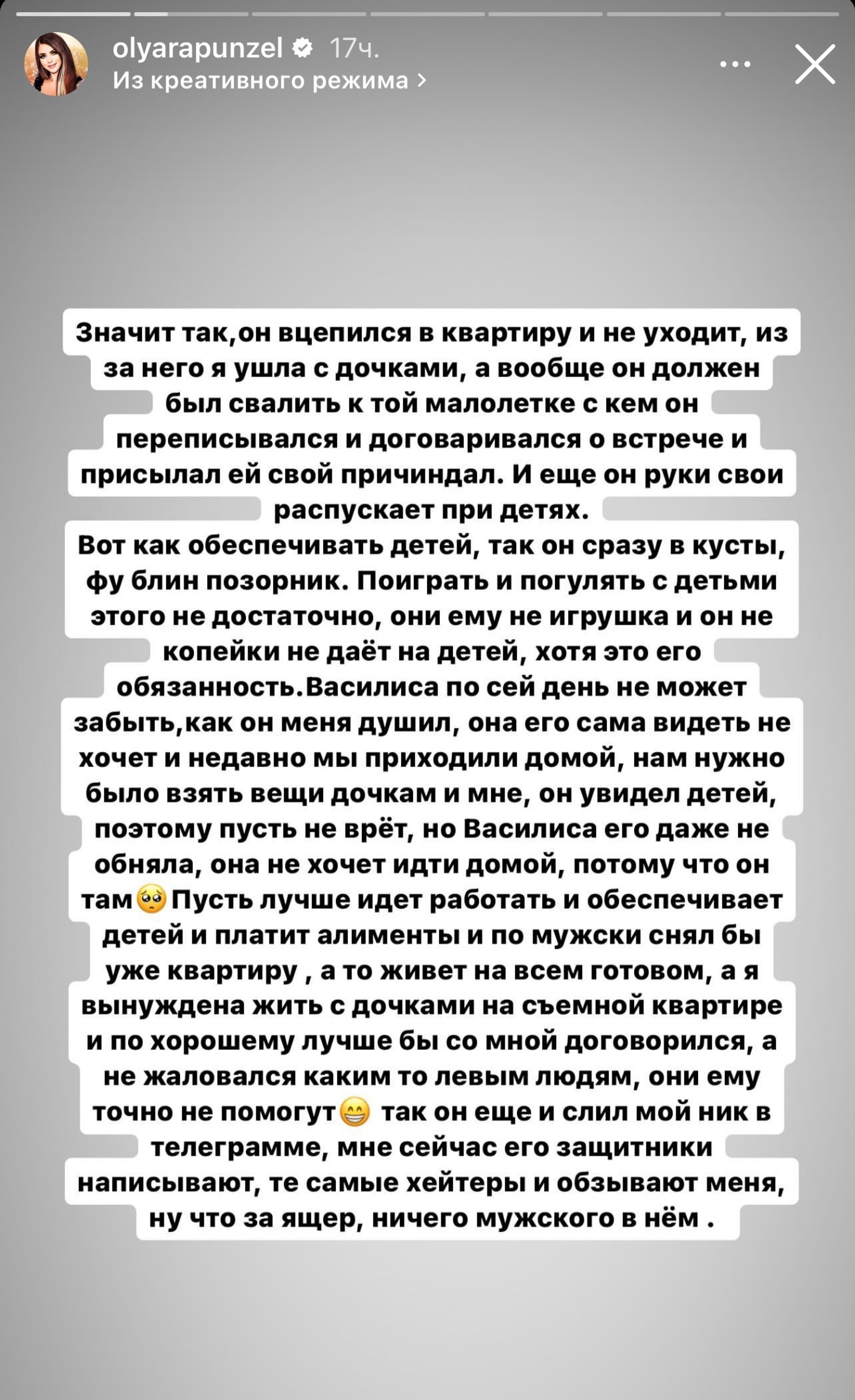 Практически ни дня не проходит без новых подробностей громкого развода. Вот и вчера Ольга решила пойти еще дальше и рассказать подписчикам об изменах мужа и травле, которую он организовал. «Он вцепился в квартиру и не уходит, из-за него я ушла с дочками. А вообще он должен был свалить к той малолетке, с которой он переписывался и договаривался о встрече и присылал ей свой причиндал. <...> Так он еще и слил мой ник в Telegram, мне сейчас его защитники написывают, те самые хейтеры, и обзывают меня. Ну что за ящер, ничего мужского в нем», — высказалась звезда реалити.