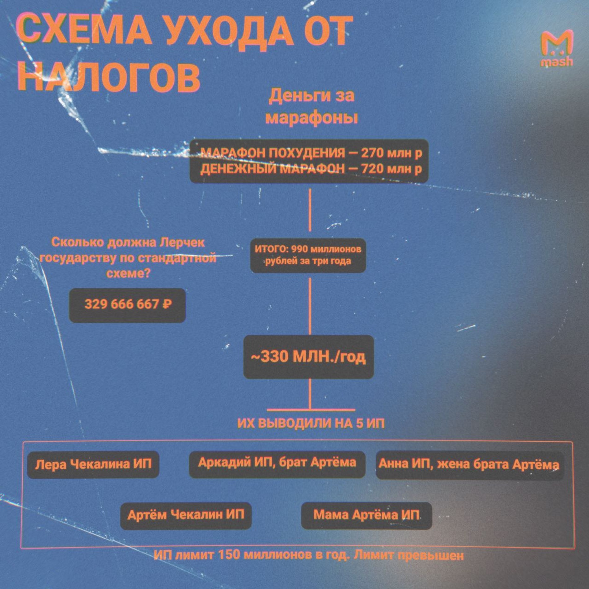 Но вот с заработком на марафонах не всё так гладко. За курсы по похудению и заработку Лерчек получает примерно по 330 миллионов в год. Но при этом, чтобы платить всего 6% дохода по упрощённой схеме, нужно зарабатывать не больше 150 миллионов. Какой выход? Раздробить деньги между пятью ИП: собственным, мужа и его родственников. Если считать по закону, Чекалины недоплатили казне 329,6 миллиона рублей за три последних года.