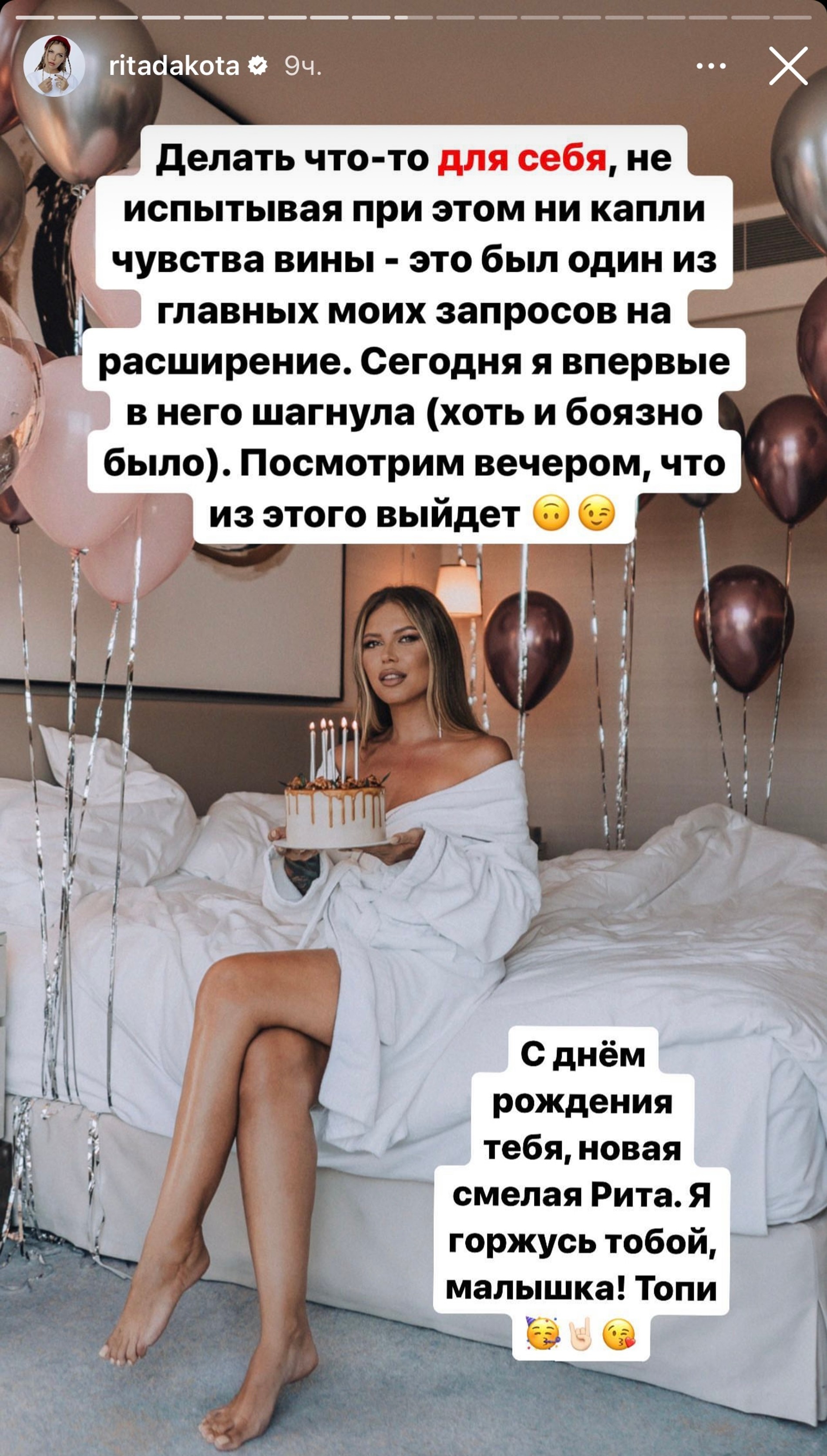 «Каждый год в этот день я делала что-то нужное, доброе и крайне положительное — и обязательно для других людей. Я кого-то спасала, тащила, реабилитировала. И в этом году первый раз в жизни я хочу сделать что-то только для себя. А именно если у вас есть желание поздравить меня с днем рождения, хочу оставить номер карты для того, чтобы собрать сумму и пустить ее на продвижение моего альбома. Наверное, это самый заветный подарок, который я хотела бы получить от своих слушателей, поклонников и друзей, — чтобы этот альбом услышало больше 10 миллионов человек», — вот так честно заявила Рита в запрещенной соцсети.