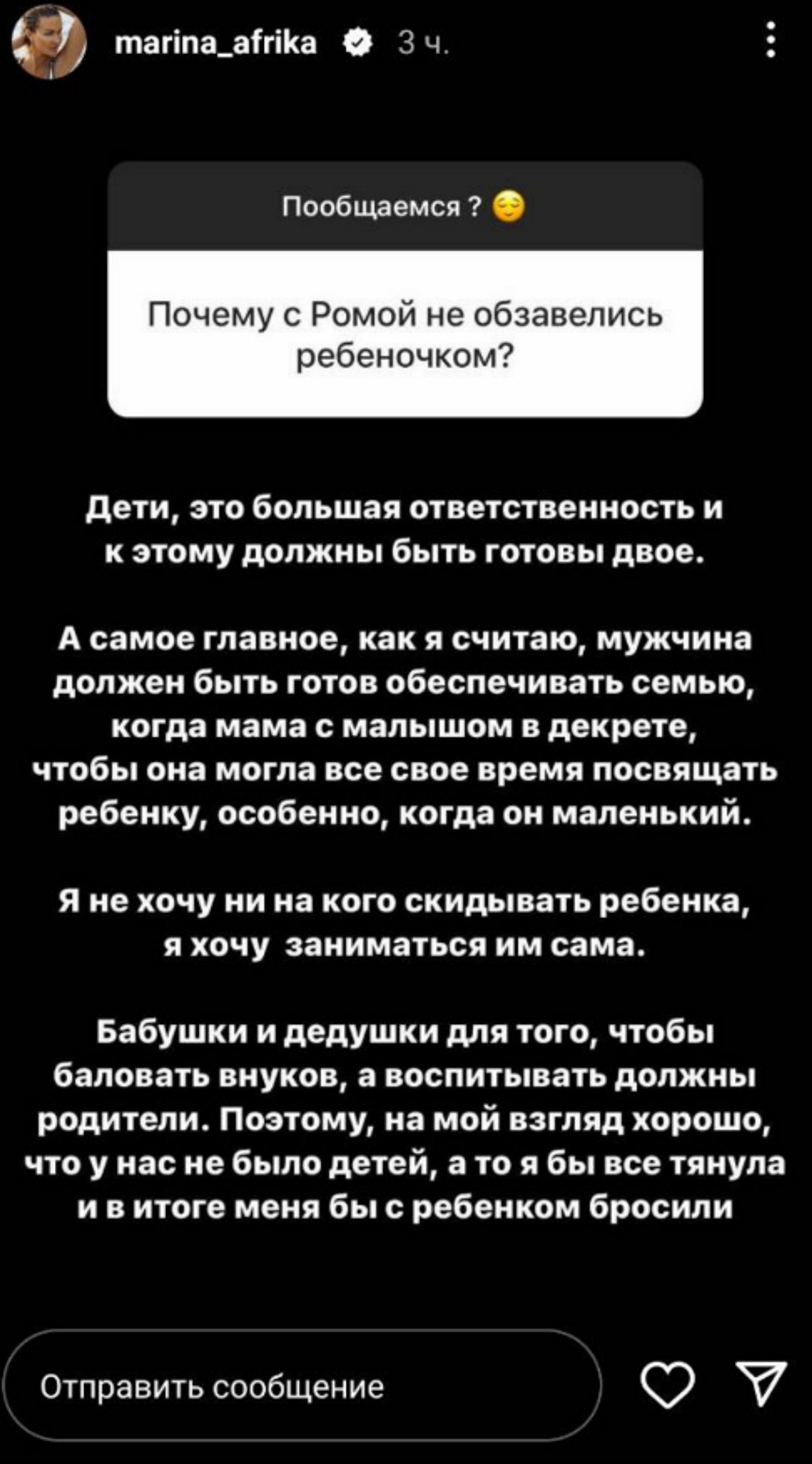Девушка констатировала, что, конечно, дети — это большая ответственность, к которой должны быть готовы оба супруга. Мужчина, по мнению Марины, должен быть в состоянии обеспечивать семью, особенно когда мама находится в отпуске по уходу за ребенком, чтобы она могла все свое время посвящать маленькому ребенку. «Я не хочу ни на кого скидывать ребенка, я хочу заниматься им сама. Бабушки и дедушки — для того, чтобы баловать внуков. А воспитывать должны родители. Поэтому, на мой взгляд, хорошо, что у нас нет детей, а то я бы все тянула и в итоге меня бы с ребенком бросили», — заключила экс-участница телестройки.