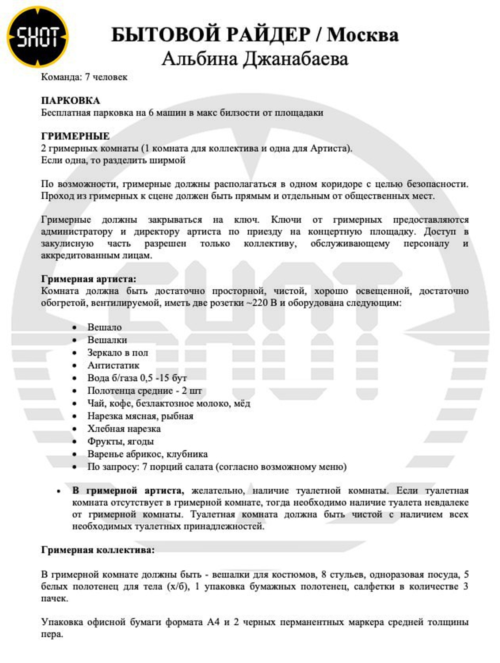 Пока Валерий Меладзе старается не светиться после скандала, его супруга времени даром не теряет. Альбина Джанабаева, как пишет телеграм-канал Shot, планирует концерты и корпоративы в России в долгосрочной перспективе. А еще в распоряжение издания попал райдер певицы. И по звездным меркам просит она немного. За само выступление — скромные 850 тысяч рублей, на столе в гримерке хотела бы видеть чай, кофе, молоко, хлеб, немного мяса и рыбы, фрукты и овощи, а также семь порций салата согласно возможному меню. Кроме того, если для ее музыкантов отдельной комнаты не найдется, Альбину устроит общая, но с ширмой. Желательно и наличие туалета в гримерной, но если его там нет, то можно и неподалеку.