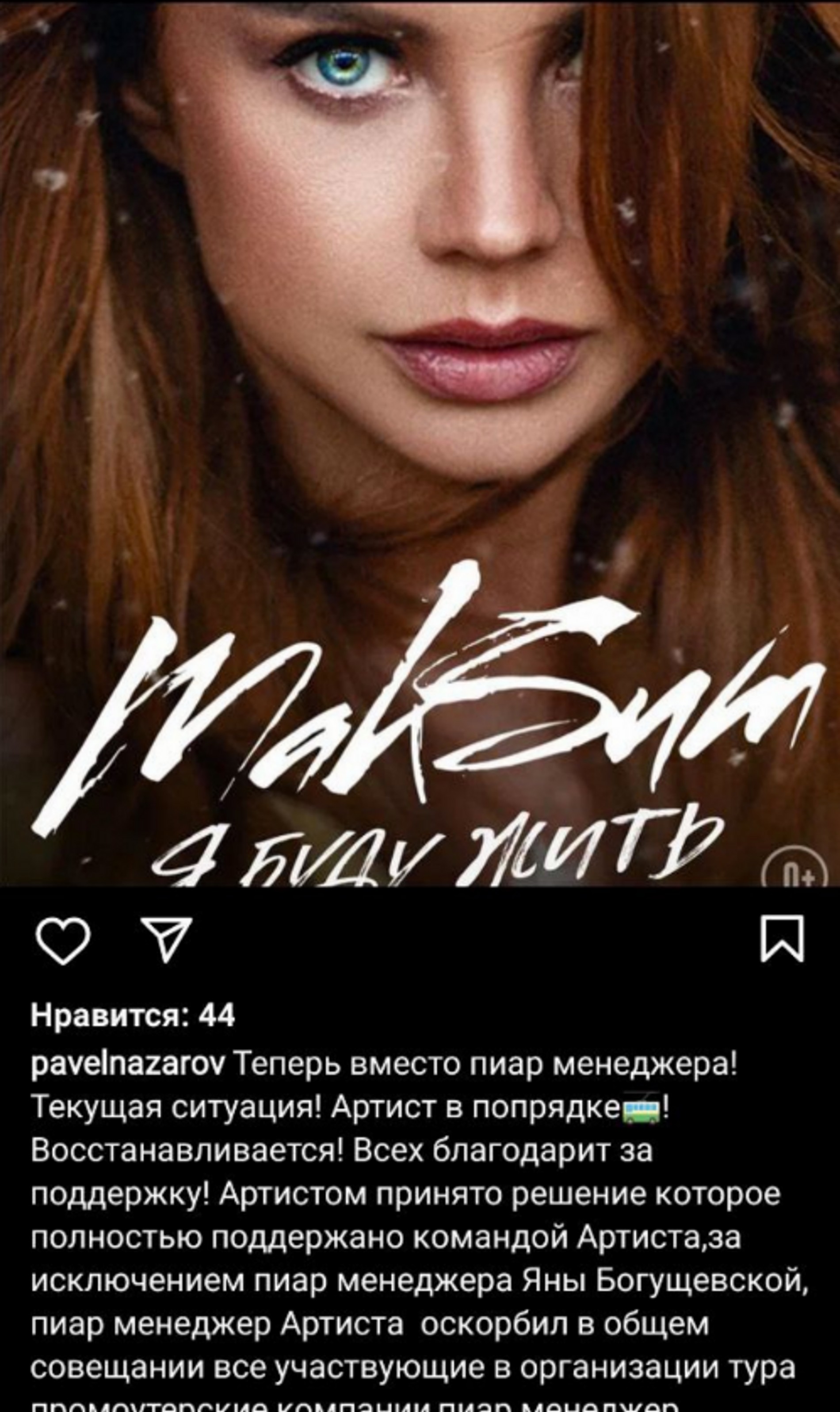 «Сегодня наш "любимый" концертный директор Павел Назаров выжал очередной "шикарный" пост, в котором призывает всё сообщество спасать МакSим. Сегодня Павел прав, как никогда: МакSим действительно нужно спасать, спасать от Павла Назарова, который отгородил артиста ото всех, кто ему дорог, ото всех, кому она не безразлична, от всего её фан-клуба. А теперь пытается очернить своими высказываниями и того человека, который все и всегда делал для артиста. И причина его сегодняшнего эпоса именно в том, что Яна всеми силами пытается отгородить МакSим от Павла. Он хочет все музыкальное сообщество обратить на это внимание? Да пускай, пускай все смотрят, как история Винтажа и Насти Задорожной продолжается с МакSим. Как Павел Назаров убивает артиста, утверждая, что это именно её решение. Это ложь! Наглая, гнусная, лицемерная! Все, кто имеет возможность приехать к МакSим, просим вас это сделать и своими глазами посмотреть на её состояние. И вы сразу сами всё поймёте! Это уже не просто посты поклонников об отмене тура! Речь идёт уже о жизни человека, ценнее которой в мире нет ничего!!!»