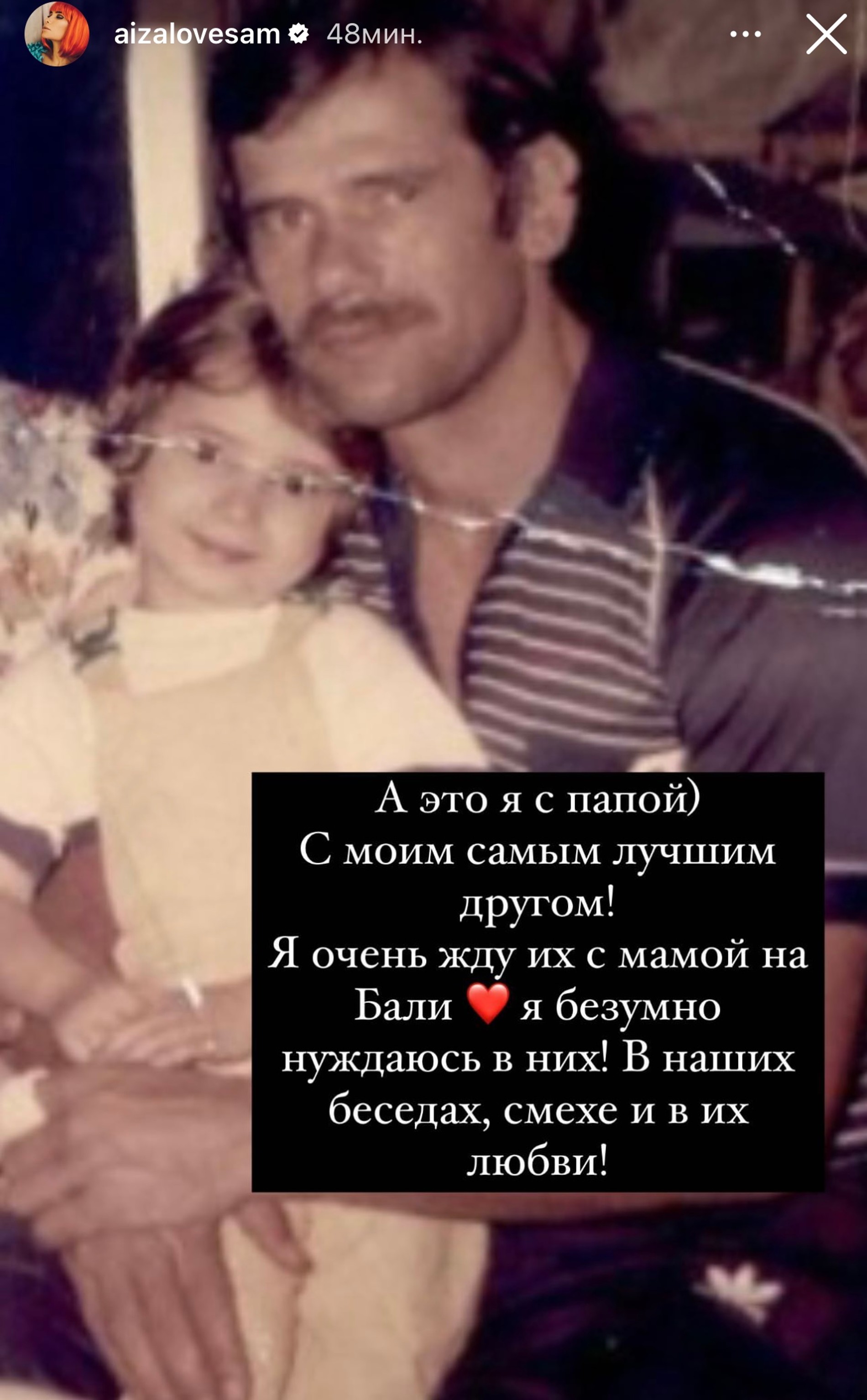 Продолжая ностальгировать, девушка поделилась детским снимком с отцом. В подписи к атмосферной фотографии Айза призналась, что очень скучает по родителям и ждет их приезда на Бали.