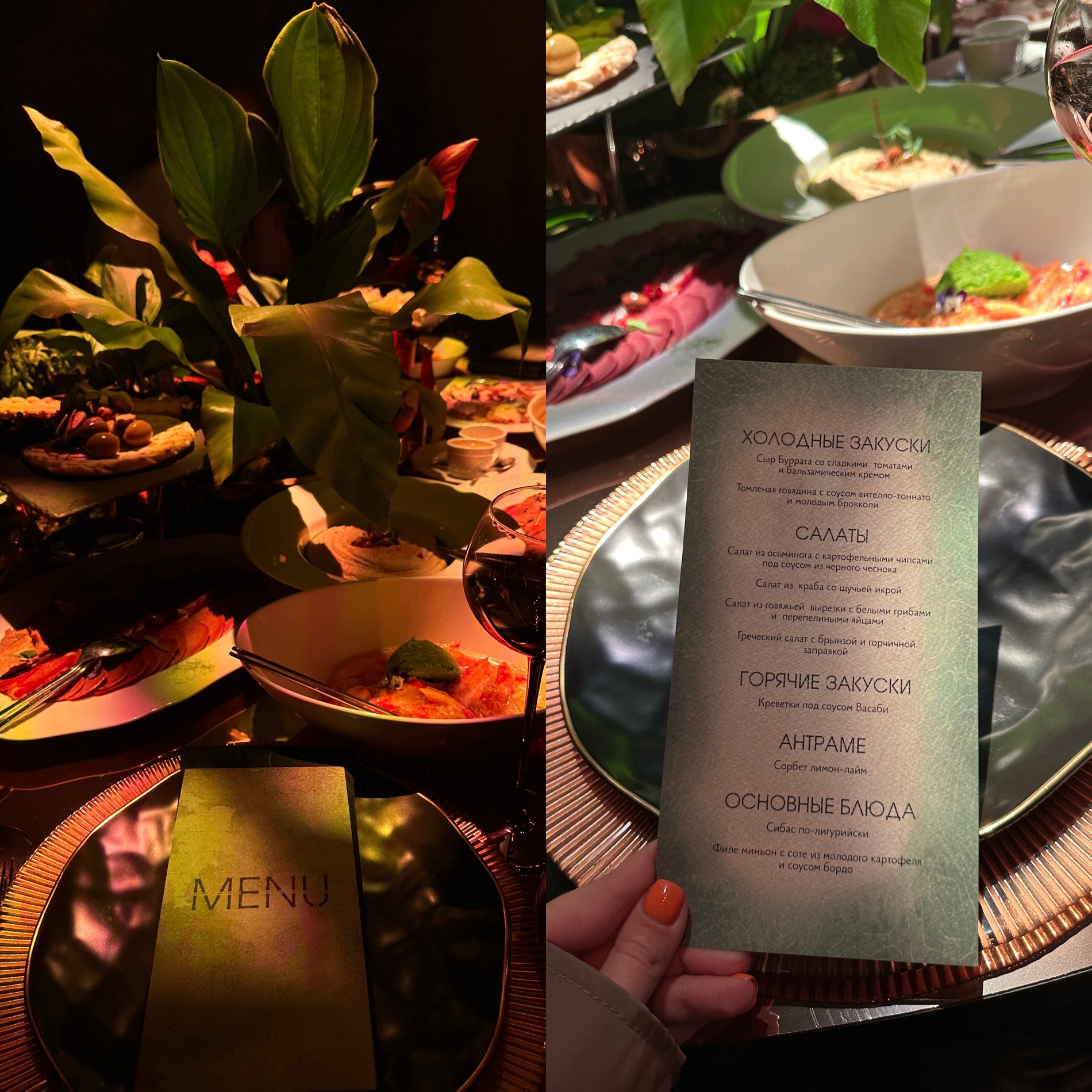 Кормили гостей разнообразно, вкусно, одним словом дорого-богато. Из закусок: томленая говядина, сыр буррата со сладкими томатами. Салатов было аж четыре — наш взгляд упал на варианты из осьминога и из краба с щучьей икрой. На горячее подавали сибас по-лигурийски и филе миньон. В планы редакции все еще входит похудеть к лету, но в этот вечер придерживаться диеты было бы преступлением!