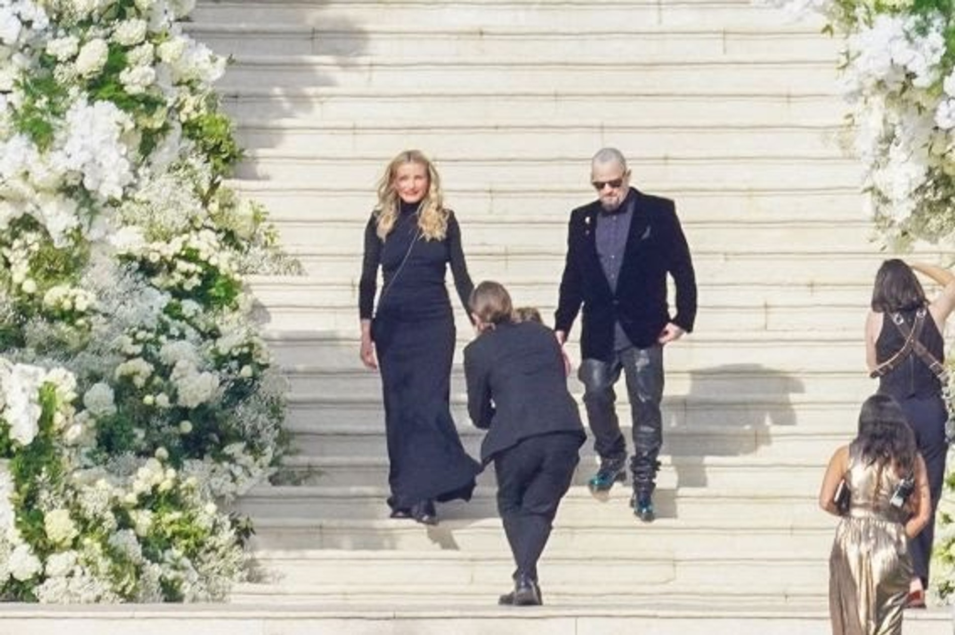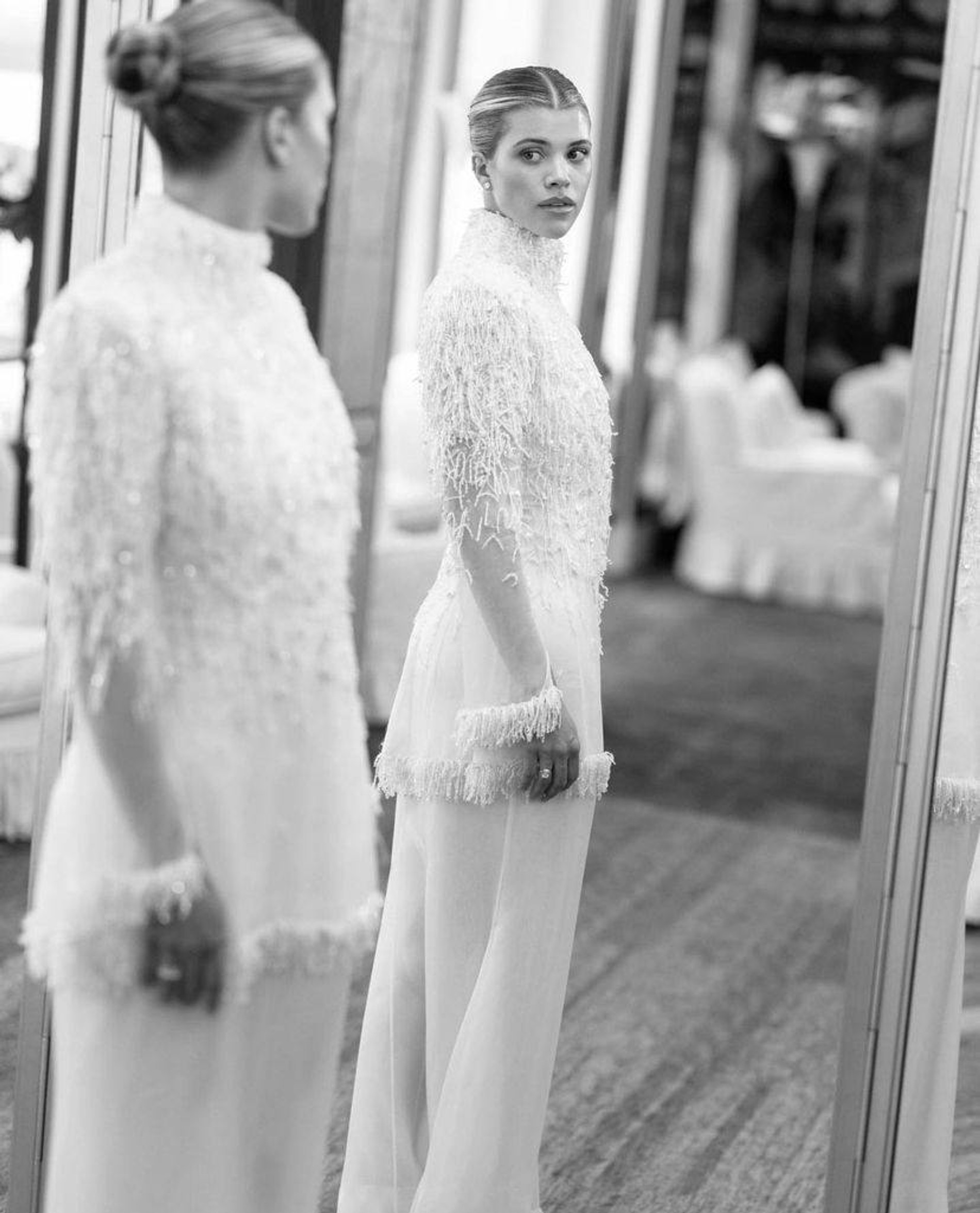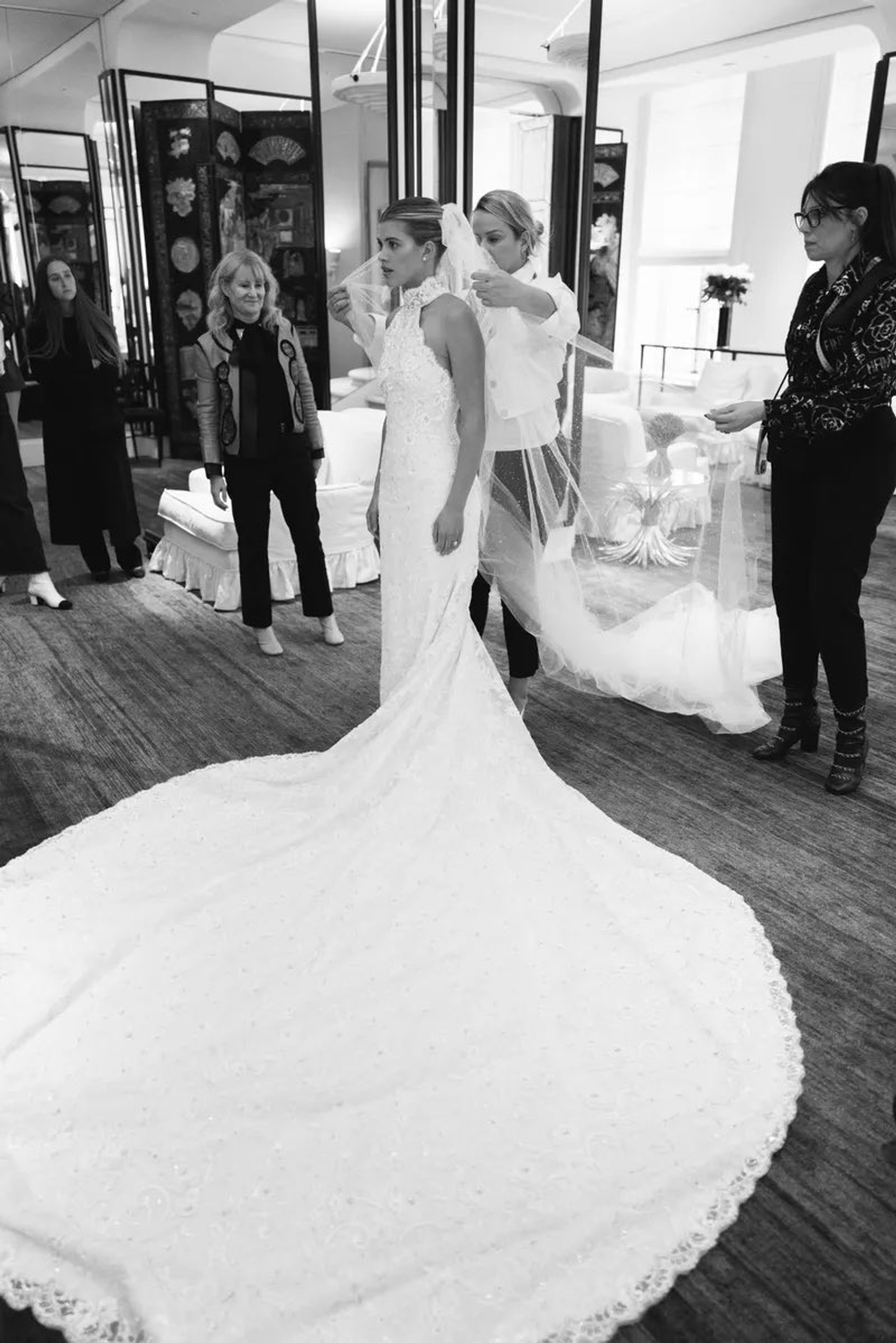 Для свадебной вечеринки специально для Софии в парижском ателье воссоздали платье из кутюрной коллекции Chanel 1993 года. Тогда на подиум в дерзком мини с камелией вышла Клаудия Шиффер.