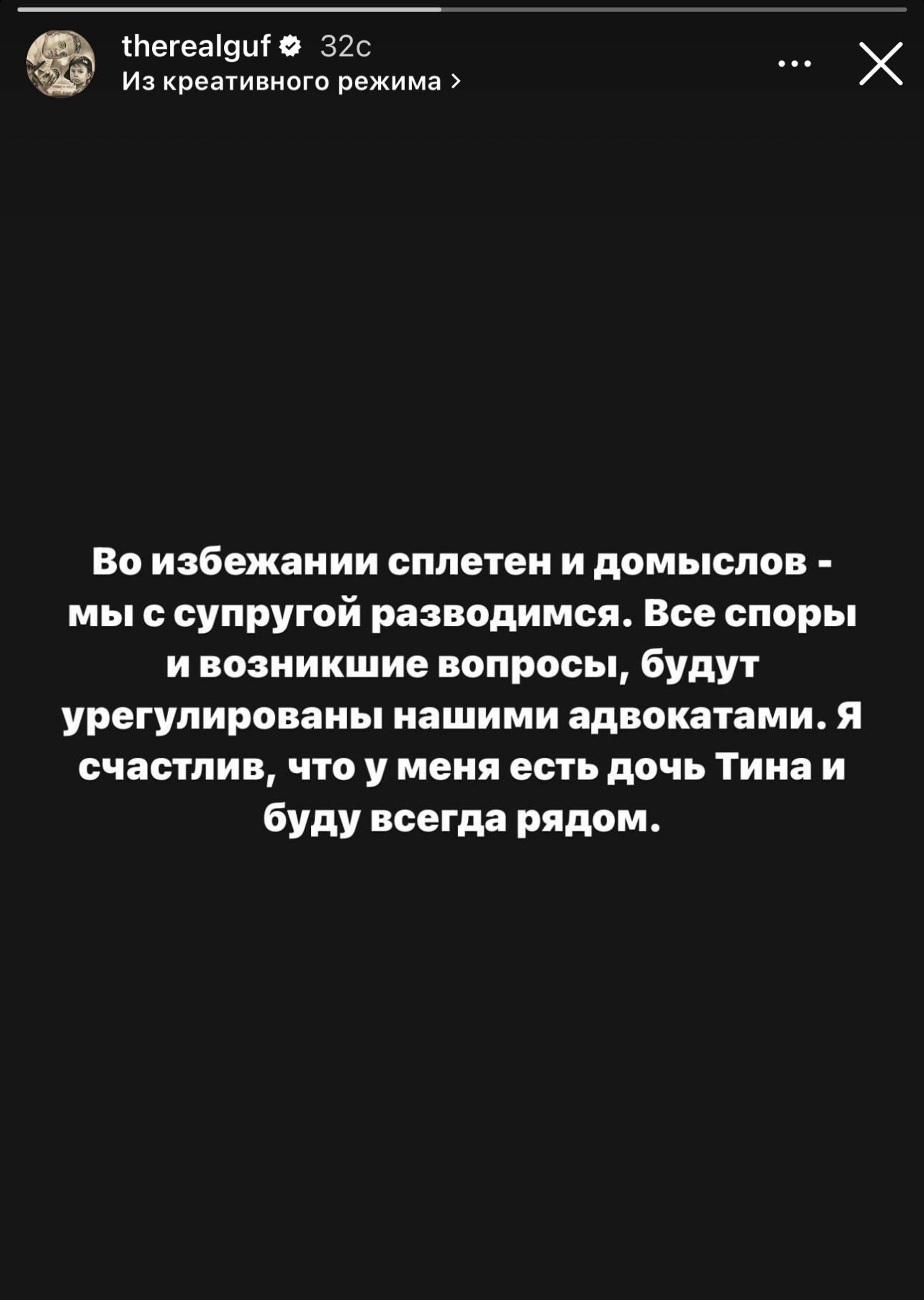 Впервые за несколько недель рэпер обратился к подписчикам с заявлением. Похоже, что скандальная ситуация в Таиланде не прошла бесследно и окончательно подорвала отношения Гуфа с его супругой Юлией. Чтобы пресечь бесконечную волну слухов, исполнитель решительно высказался о происходящем в браке в запрещенной соцсети. К сожалению и вопреки надеждам многих, пара все-таки разводится. Все остальные вопросы, по словам Гуфа, будут решать уже адвокаты. А о малышке Тине Долматов публично обещает позаботиться и всегда быть с ней рядом.