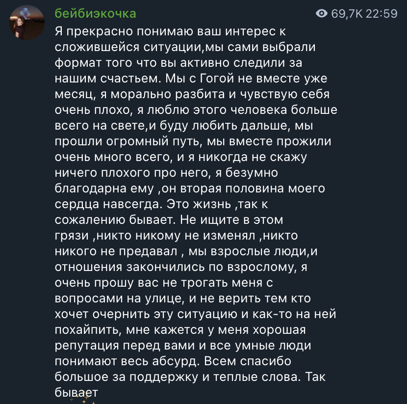 Девушка признаётся, что переживает сложный период и находится в подавленном состоянии. При этом Эка подчёркивает, что сохраняет тёплые чувства к бывшему возлюбленному и испытывает к нему искреннюю благодарность за совместно проведённое время.