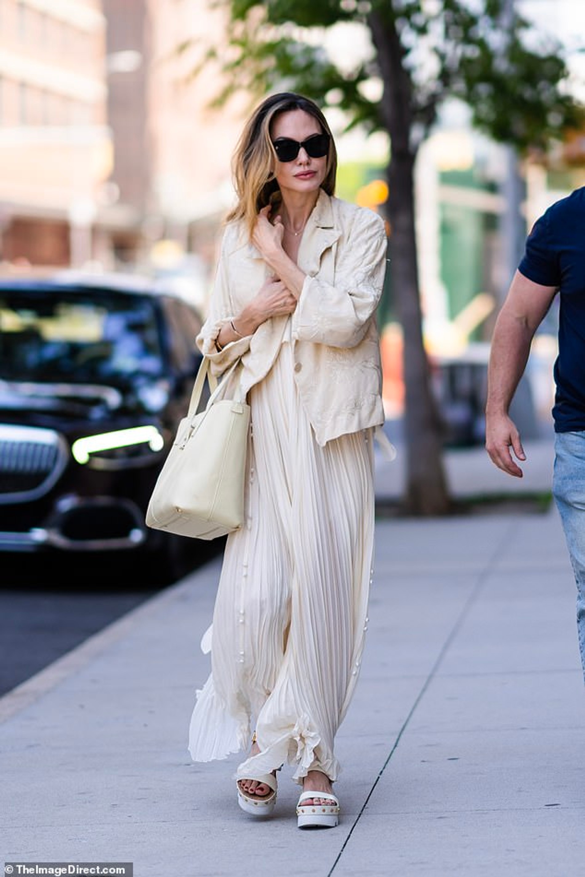 Каждый выход Анджелины неизменно становится модным мини-событием. И ее свежее появление в Нью-Йорке не стало исключением. Оскароносная актриса продемонстрировала отличный легкий образ на лето: плиссированное макси-платье кремового цвета с льняным жакетом в тон, вместительной бежевой сумкой и белыми босоножками на платформе. Согласитесь, очень элегантно, да и защита от обжигающих солнечных лучей обеспечена. Берем этот универсальный летний лук из категории «и в пир, и в мир» на заметку.