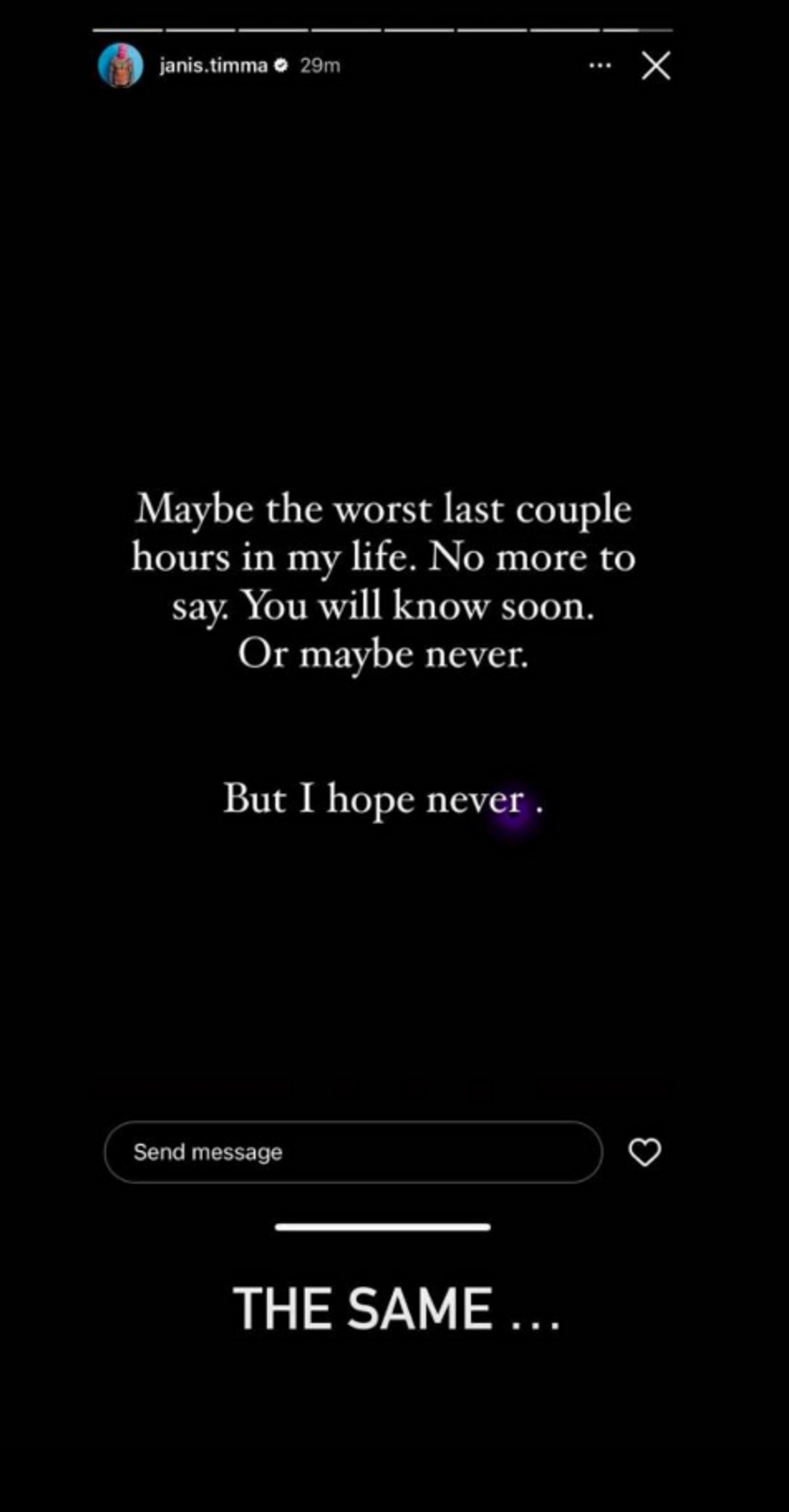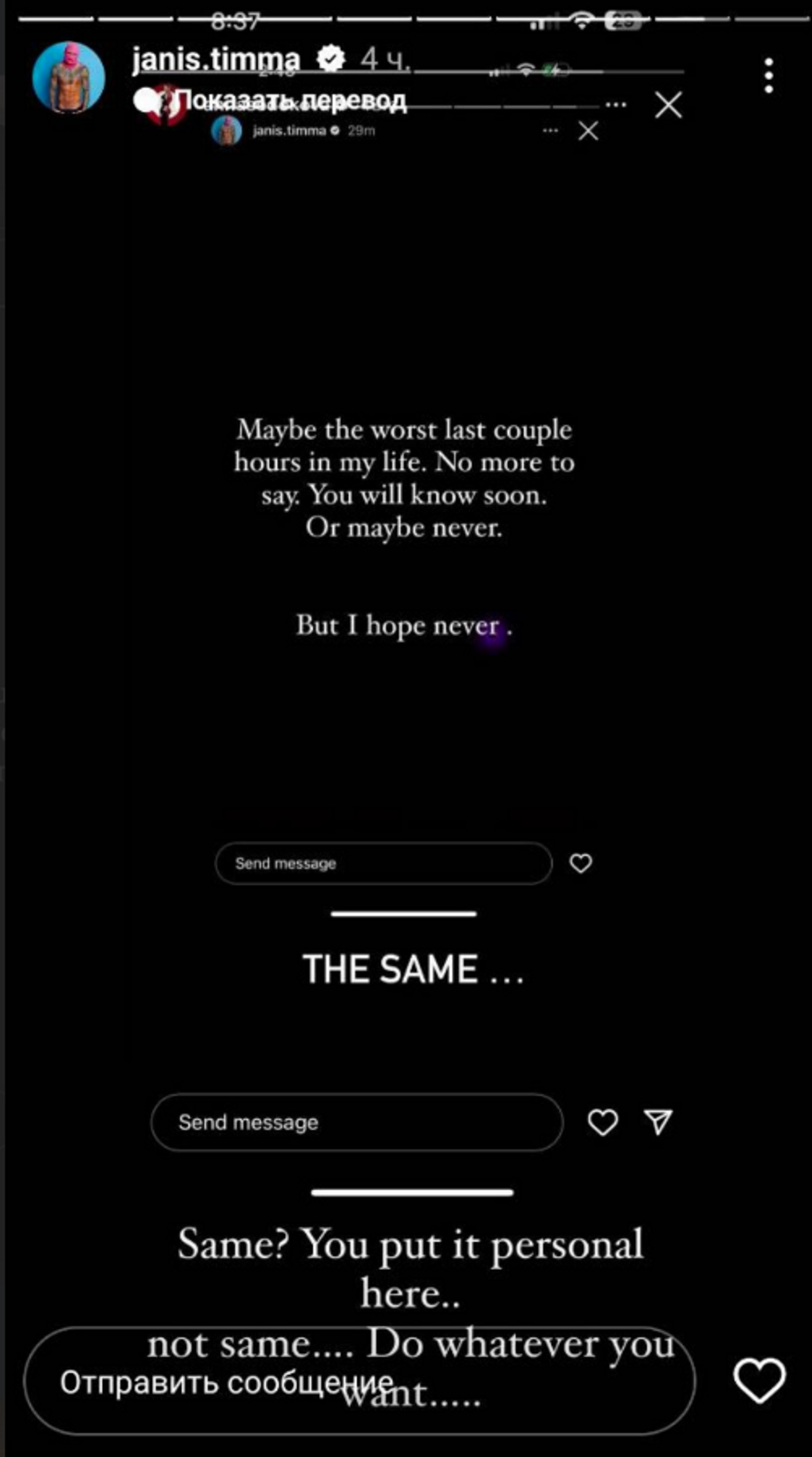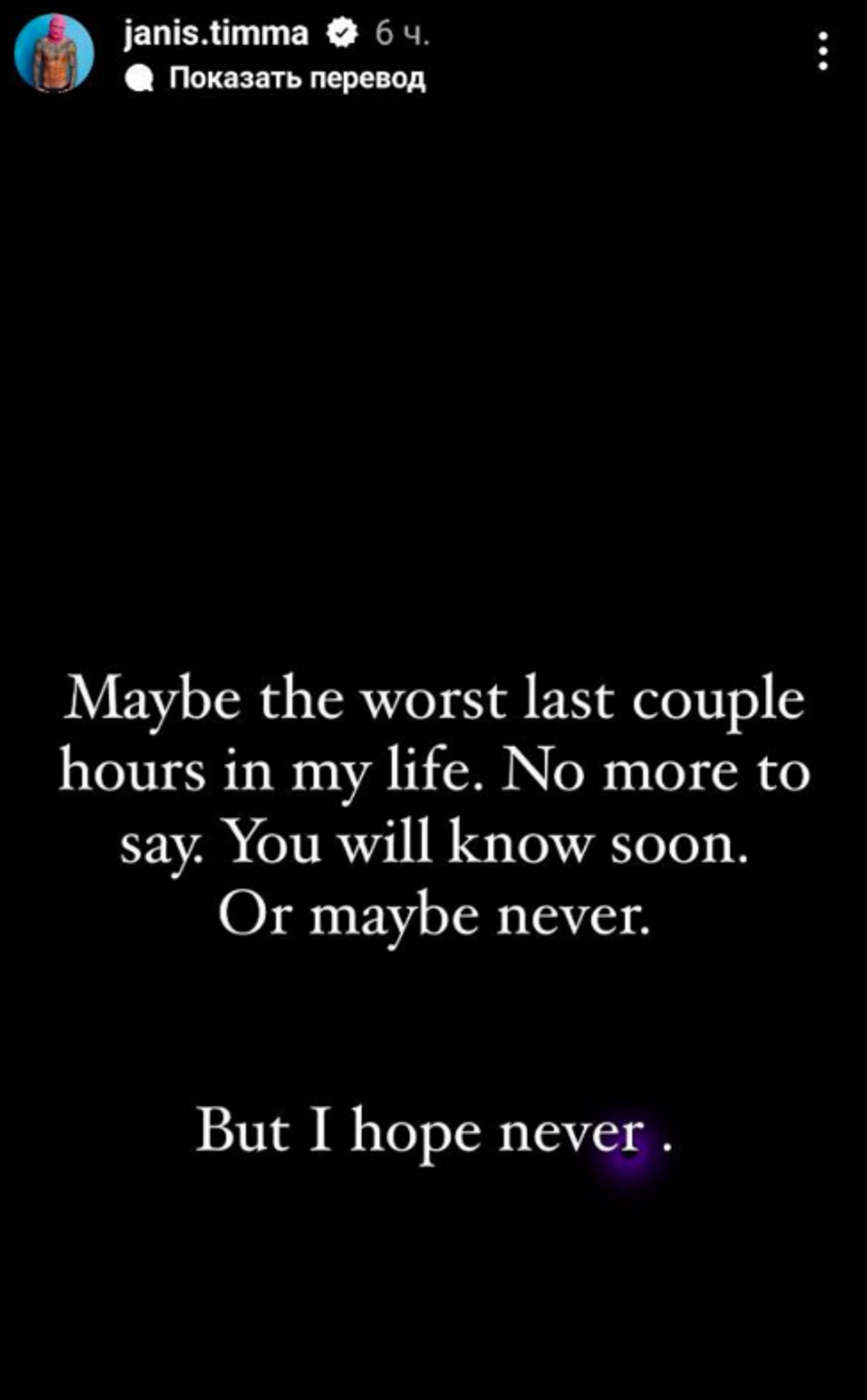 Анна Седокова и ее муж Янис Тимма этой ночью говорили друг с другом загадками, причем на весь инстаграм. Между супругами завязался довольно странный диалог в сторис, суть которого непосвященным уловить было сложно. Первым, если мы правильно поняли, высказался Янис. «Возможно, худшие последние пару часов в моей жизни. Больше нечего сказать. Ты скоро узнаешь. Или, может быть, никогда. Но надеюсь никогда», — написал баскетболист, обращаясь то ли к жене, либо еще к кому-то.