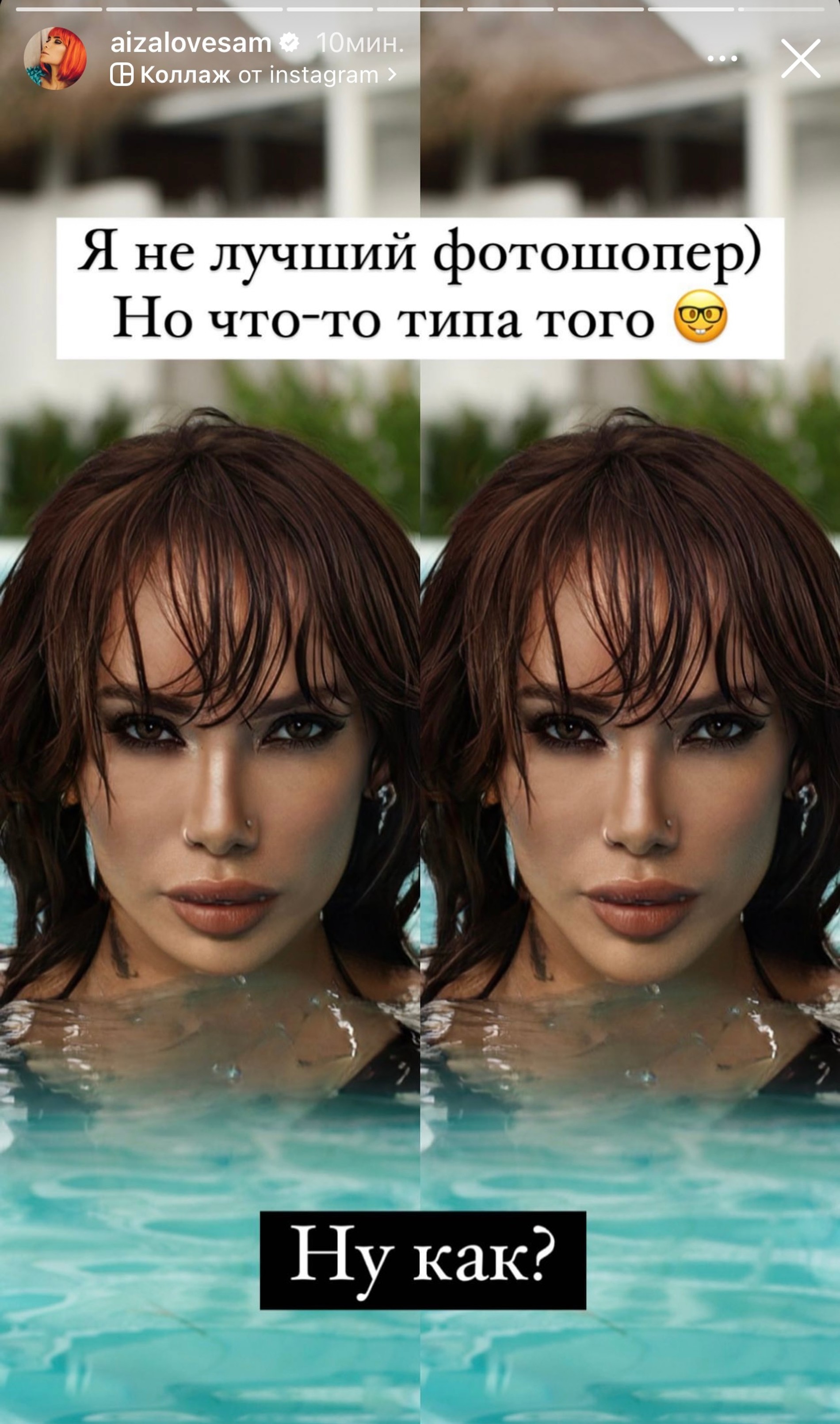 «Короче, я решила в кои-то веки посмотреть на себя в зеркало, накрасить губы. И что-то присматриваюсь к себе, и у меня такое ощущение, что мне подбородок нужен. Как будто он какой-то маленький... Думаю, может, подбородок накачать?» — обратилась к подписчикам Айза. Да уж, вопрос действительно серьезный, так что просим пользователей Сети не подвести девушку с советом! А чтобы легче было представить ее с «новым» подбородком, Айза даже потрудилась и явила миру отфотошопленную версию себя.