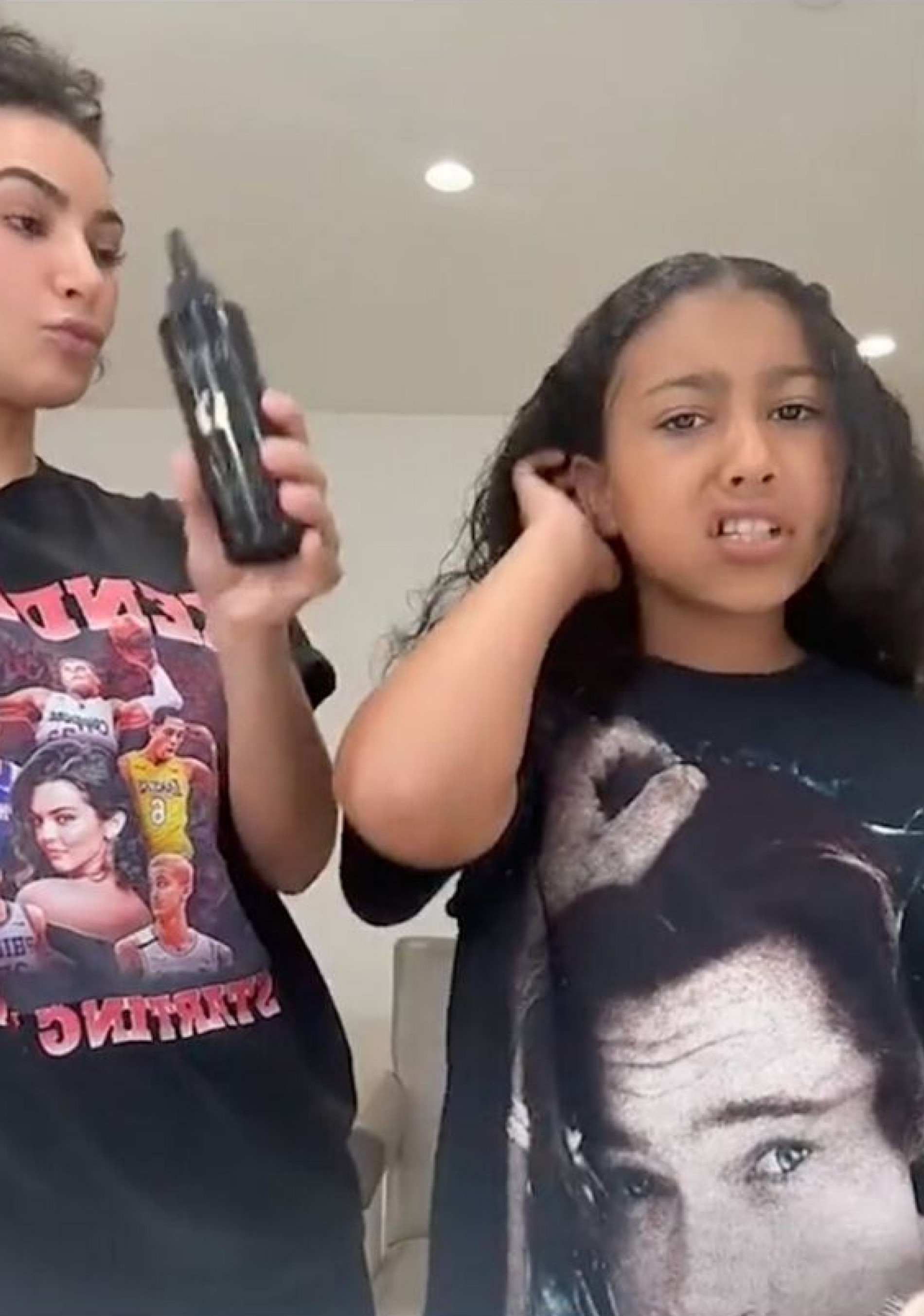 Вместе со своей девятилетней дочерью Норт звезда сняла видеоурок по прическам для мам и дочек. Ким предстала в непривычном для нее расслабленном образе: естественный макияж, волосы собраны в небрежный пучок, черная футболка с принтом. Самые внимательные подписчики звезды сразу обратили внимание на изображение.