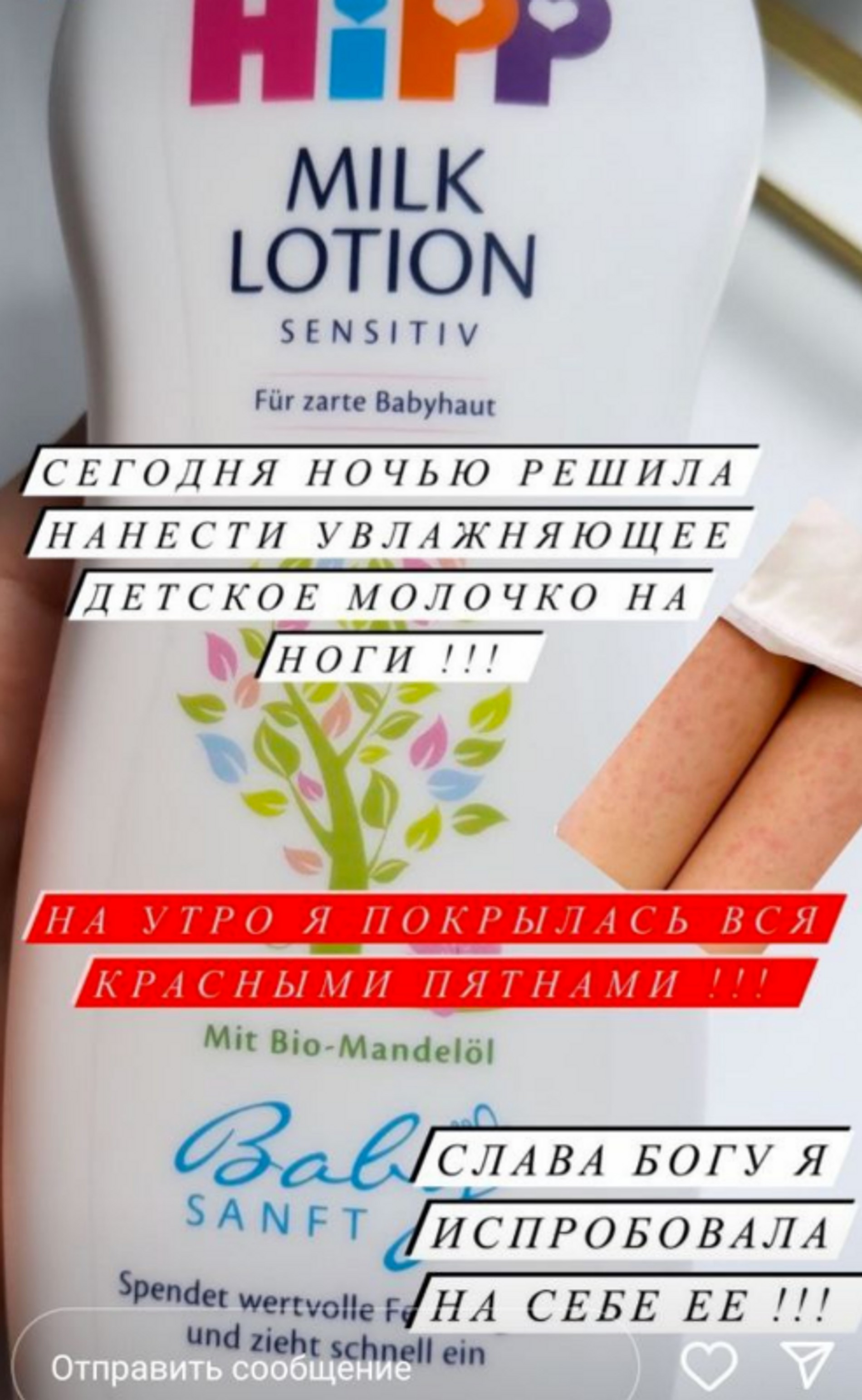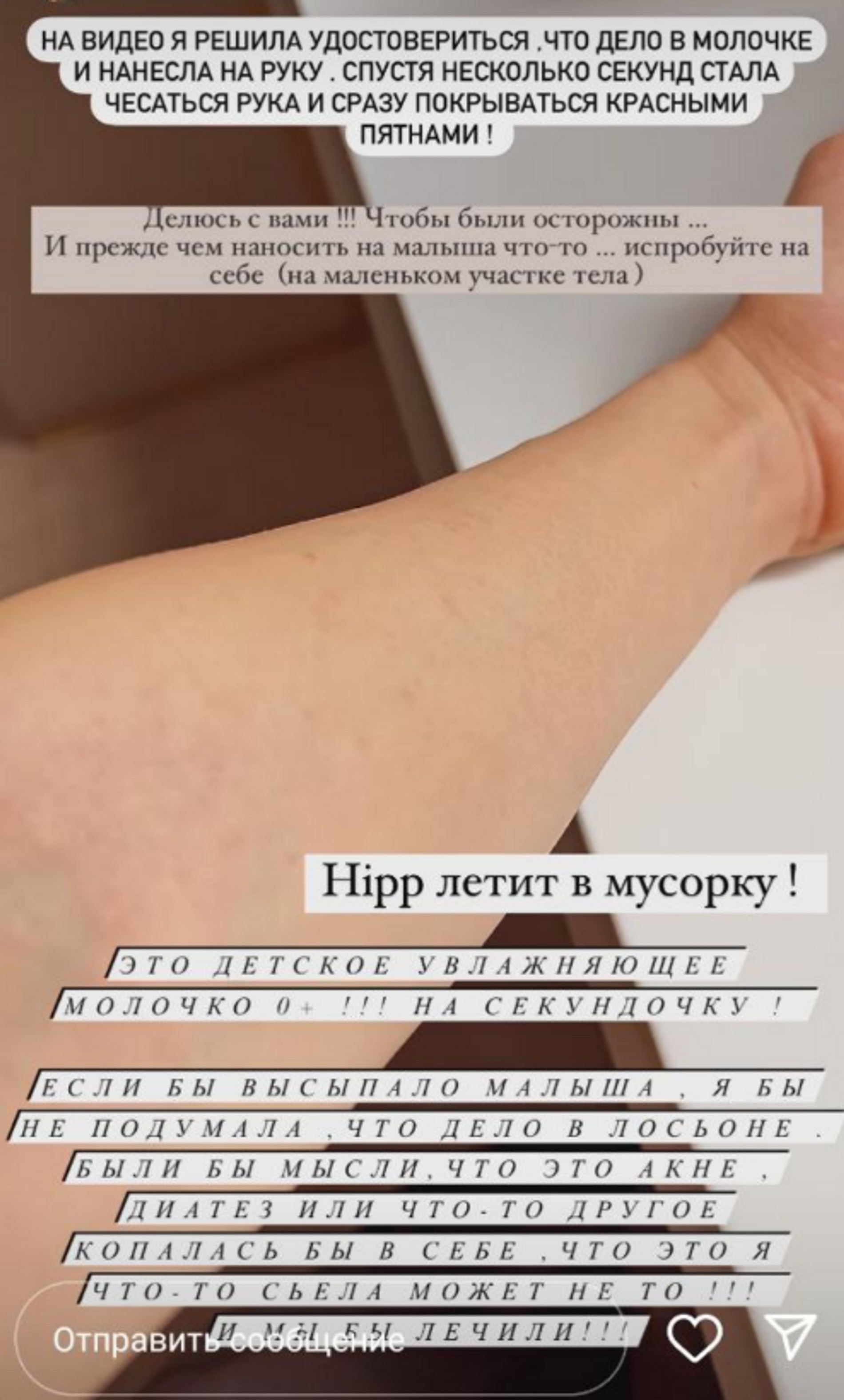 «Сегодня ночью решила нанести увлажняющее детское молочко на ноги. На утро я покрылась вся красными пятнами! Чтобы удостовериться, что дело в молочке, я нанесла его на руку и спустя несколько секунд стала чесаться рука и сразу покрываться красными пятнами! Слава богу я испробовала на себе! Hipp летит в мусорку! Это детское увлажняющее молочка 0+ на секундочку! Если бы высыпало малыша, я бы не подумала, что дело в лосьоне. Были бы мысли, что это акне, диатез или что-то другое. Копалась бы в себе, что это я что-то спела не то! И мы бы лечили! Делюсь с вам, чтобы вы были осторожны. И прежде чем наносить на малыша что-то, испробуйте на себе (на маленьком участке тела)», — предостерегла актриса.