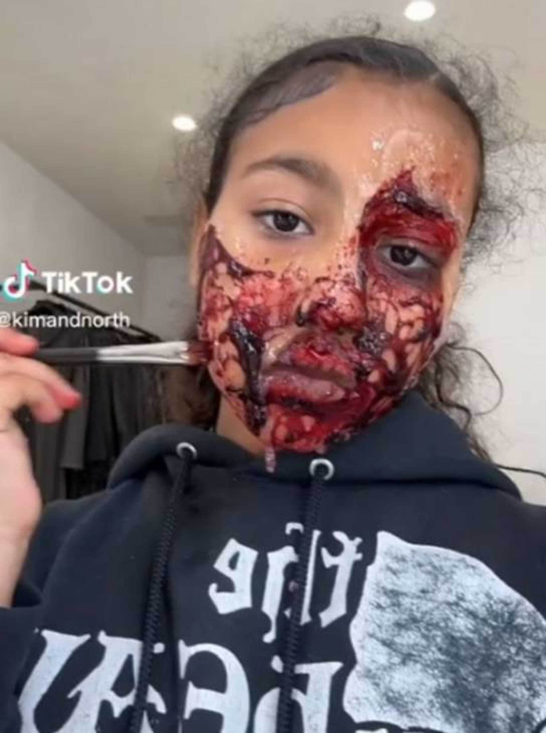 Неужто произошел несчастный случай или на ребенка, упаси МВД, кто-то напал? Без паники! Таблоиды полагают, что это не настоящая кровь, а специальный грим. Норт давно известно своим пристрастием к жанру horror makeup, это раз, а еще она любит всех разыгрывать, это два.