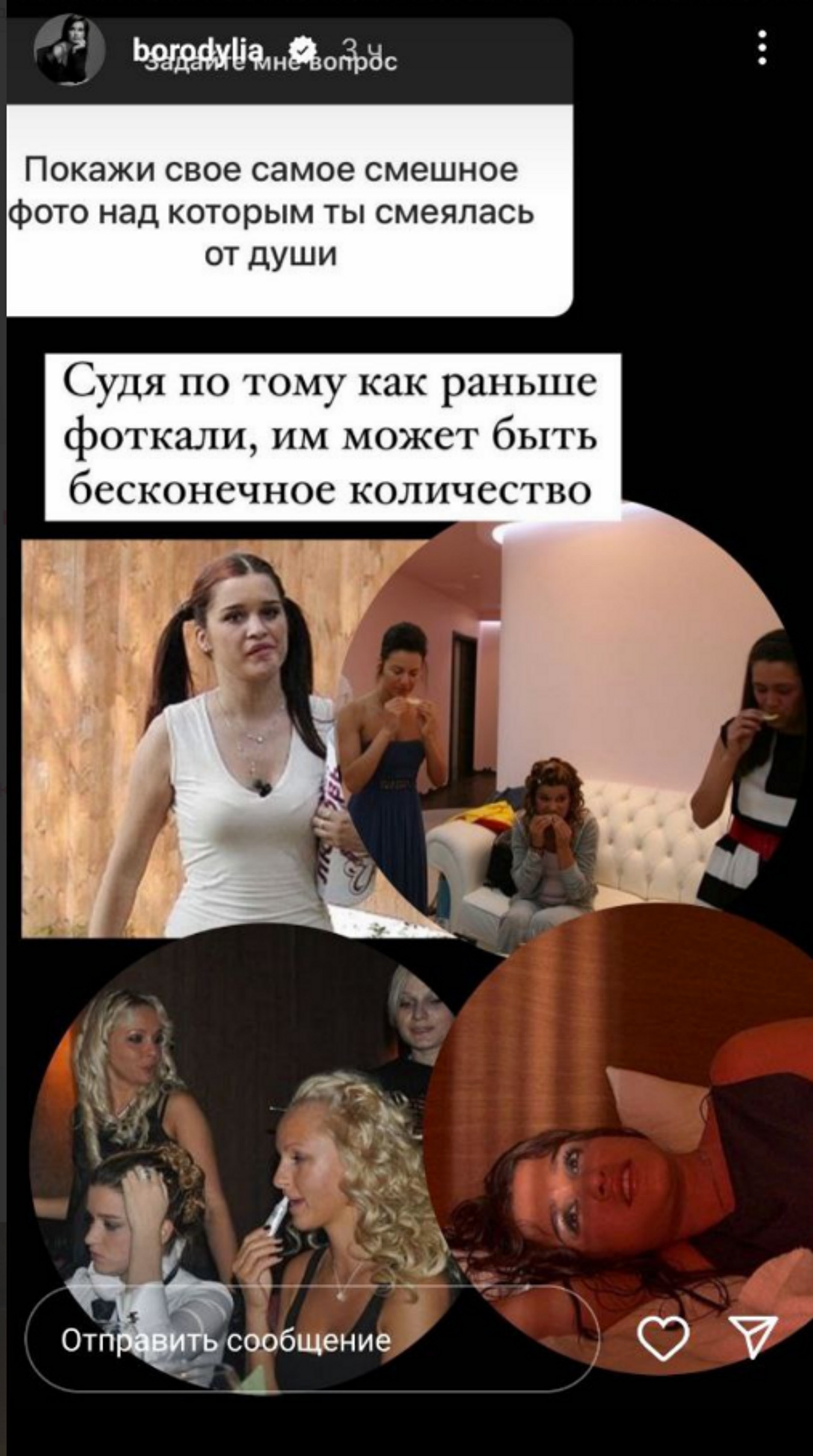 Минутка самоиронии и юмора случилась в аккаунте Ксении Бородиной в запрещенной сети. В рубрике «Вопрос-ответ» подписчики попросили телеведущую показать им ее самую смешную фотографию, глядя на которую она может посмеяться от души.