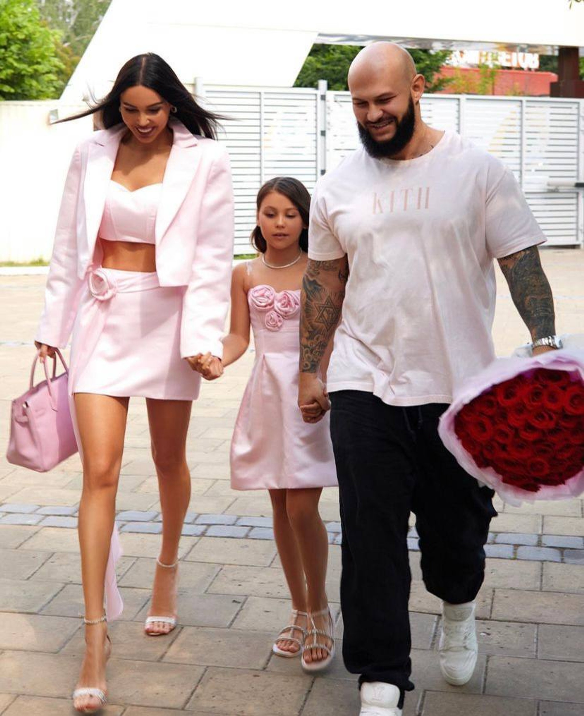 На утренник девочка пришла в сопровождении своих знаменитых родителей. И хотя Оксана часто отмечает, что Лея самая подвижная и активная из дочерей, и даже называет ее «маленьким кареглазым ураганом», платье ей подобрали самое «принцессочное» из возможных: нежно-пудровое с тремя розочками на лифе. Мама нарядилась в соответствующем стиле, а Джиган... ну, Джиган тоже оделся красиво. А главное, не забыл истинно мужской аксессуар — увесистую охапку роз: в конце концов, бицепс сам себя не накачает. Вот такой ЗОЖ по-джигановски мы всецело одобряем!