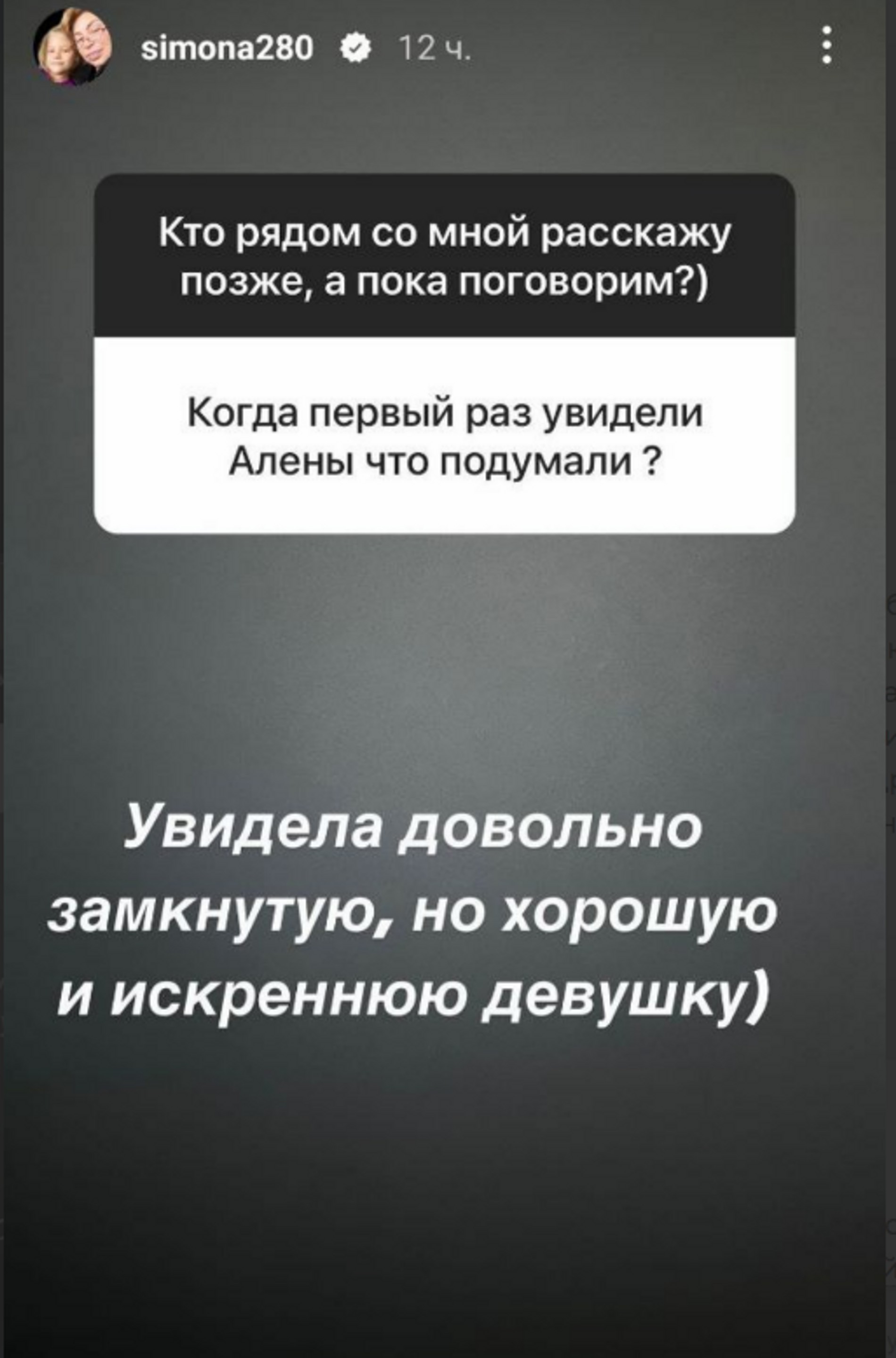 В процессе последнего сеанса общения с подписчиками у Симоны Яковлевны спросили, что она подумала о маме своей внучки Алисы, модели Алене Шишковой при первой встрече. «Я увидела довольно замкнутую, но хорошую и искреннюю девушку», — честно призналась женщина.