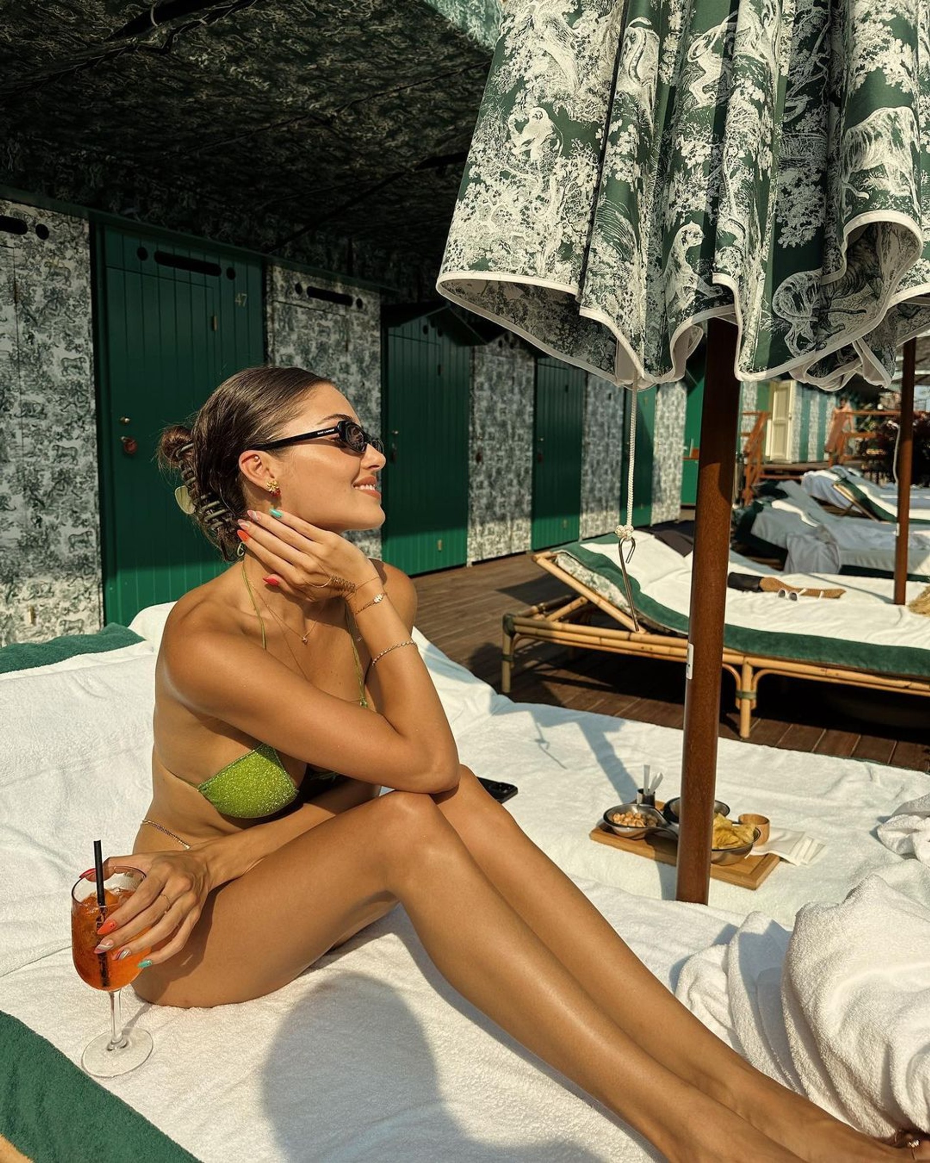 Сейчас звезда сериала «Постучись в мою дверь» отдыхает в Портофино, где ничего кроме эффектных мини-бикини надевать не хочется — прекрасно понимаем! А заодно берем на заметку самые модные цвета и сочетания: сияющий зеленый и бело-оранжевый с актуальным «огуречным» узором. Ну а когда все-таки хочется чего-то более закрытого, выбираем цельный ярко-желтый купальник с эффектным глубоким декольте и не менее впечатляющими золотыми украшениями, как у Ханде. Кстати, для прохладных летних вечеров актриса тоже припасла красивый вариант: достаточно дополнить верх от купальника белым жакетом и свободными брюками в тон. Осталось только обзавестись таким же роскошным загаром — и вперед!