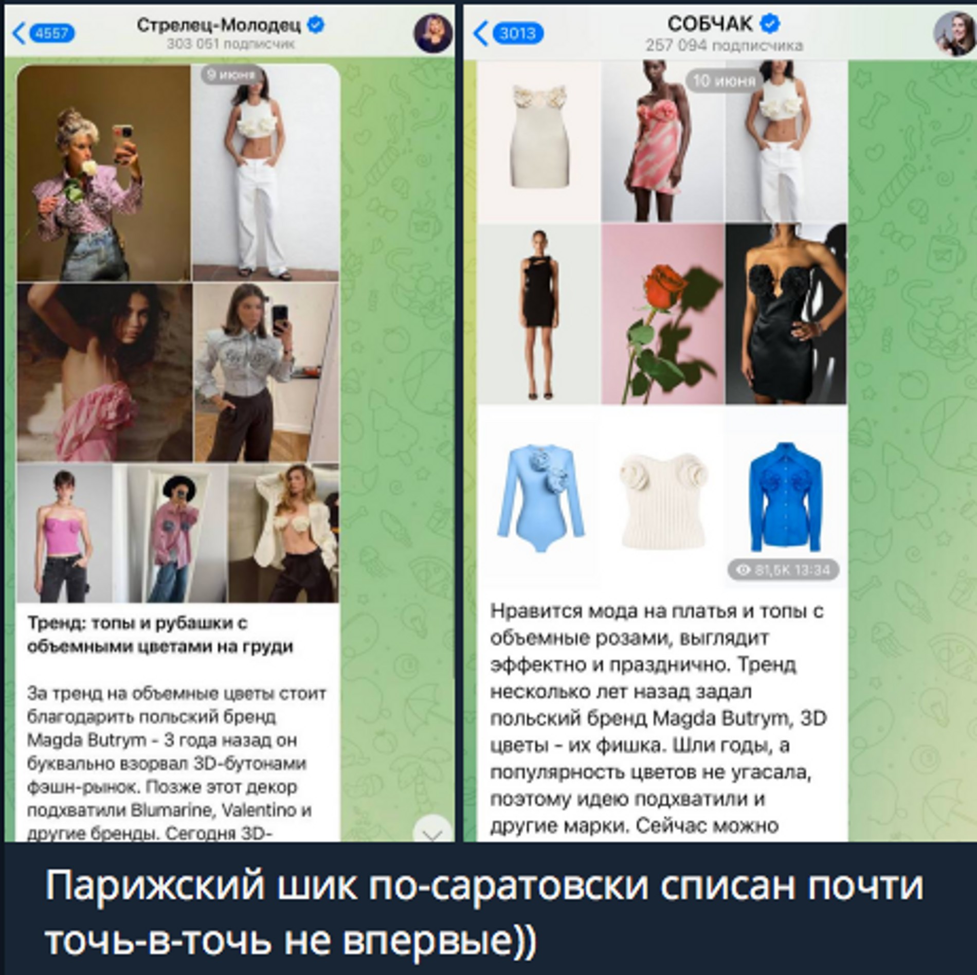Надежда поспешила отреагировать на едкий пост Ксении и предъявила доказательства того, что этот самый парижский шик по-саратовски Собчак неоднократно копировала у Надежды. «Парижский шик по-саратовски списан почти точь-в-точь не впервые», — со смайликами написала автор YouTube-канала «Стрелец-Молодец».