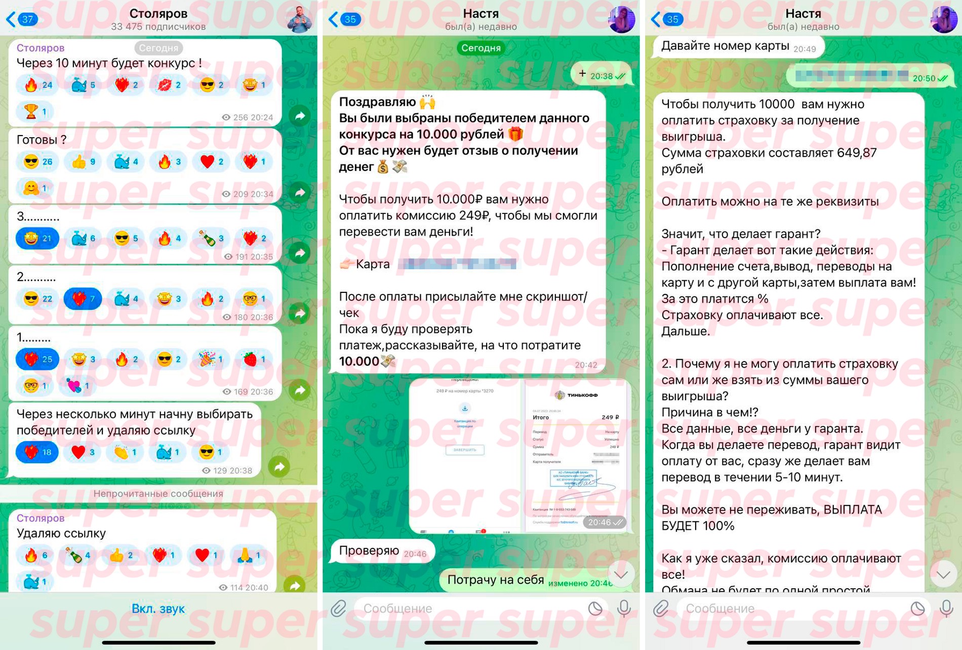 «На Telegram-канал "Столяров" я подписана несколько месяцев. Доверие изначально вызвали видео в кружочках, которые сам Алексей, как мне казалось, записывал и сразу публиковал. Периодически в канале проводили конкурсы, но я не обращала на них внимание, потому что никогда не участвовала в подобном. Вчера увидела сообщение о конкурсе: "Первые участники получат деньги". Появился пост со ссылкой, по условиям нужно было написать "+" в личные сообщения какой-то девушке. Через несколько минут его удалили. "Это логично, чтобы честно выбрать победителя", — подумала я. Написала этой девушке. Спустя минут 10 она мне ответила, написала, что я выиграла деньги. Мне переведут 10 тысяч рублей на карту, но нужно заплатить 250 рублей. Это была якобы комиссия. Я решила испытать удачу, потому что сумма была небольшой. Следом получила сообщение, что нужно доплатить еще 650 рублей. Для убедительности девушка прислала скрины другой участницы, которая так же переводила деньги. Она давила на то, что это официальная страница Столярова, он не будет рисковать репутацией. У канала более 30 тысяч подписчиков, так что я не могла подумать, что общаюсь с мошенниками. В итоге перевела и эту сумму. Потом мне пришло еще одно сообщение с просьбой заплатить 1000 рублей для получения выигрыша. Тогда я наконец поняла, что меня хотят обмануть. Теперь мне обидно не за деньги, а за то, что я повелась. Очень глупо вышло»